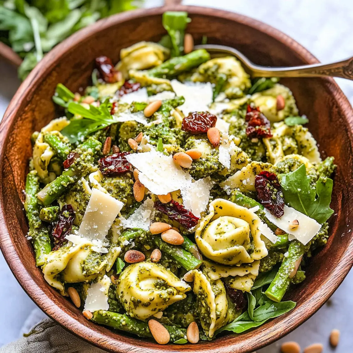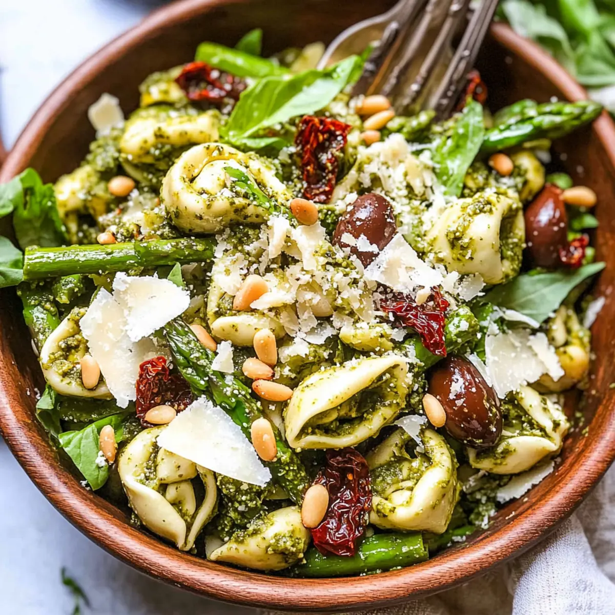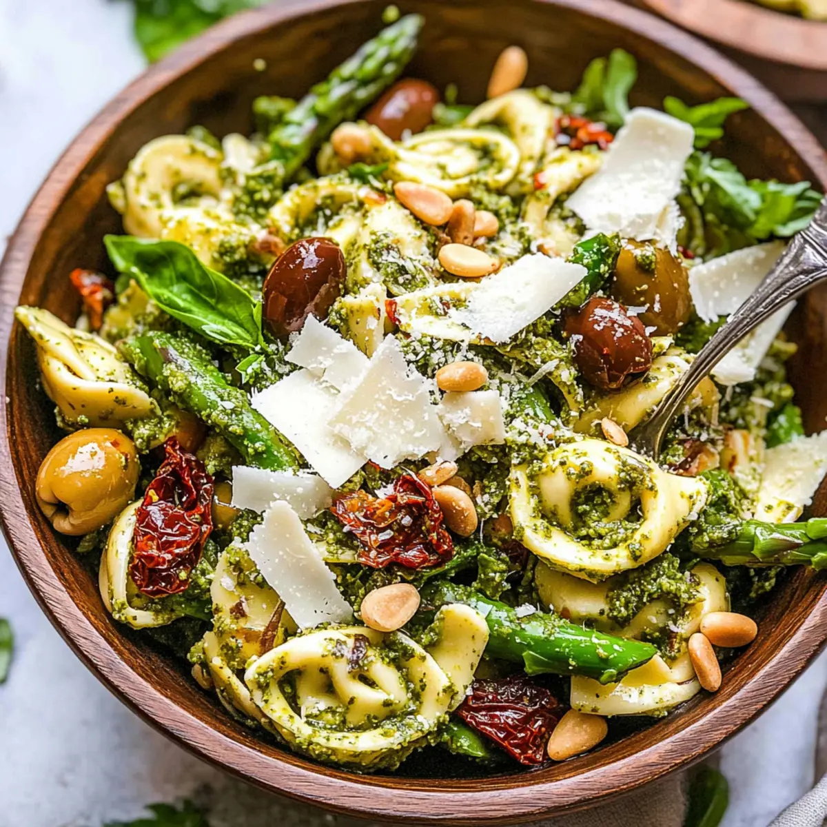 Next, add the pesto to the tortellini and asparagus mixture, stirring well to combine everything evenly. Toss in the quartered artichoke hearts, sliced sun-dried tomatoes, and Kalamata olives (if using). Add a handful of fresh arugula or baby spinach, seasoning with salt and pepper to taste. This vibrant combination will contribute to the fresh and rich flavors of the 30 Minute Pesto Tortellini Salad.