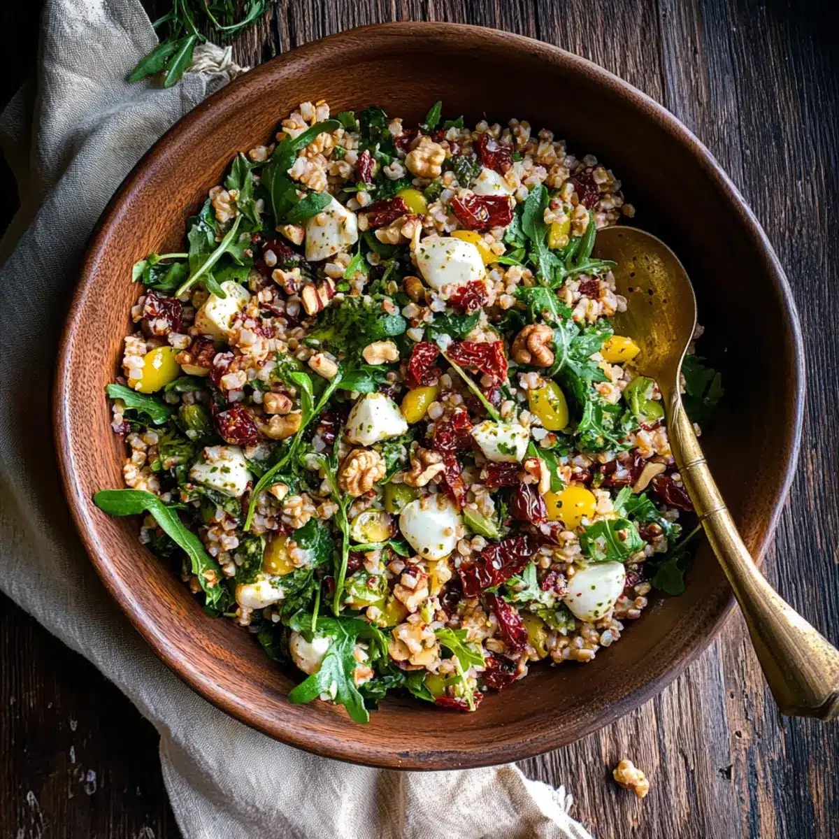 In a large bowl, mix the cooled farro, toasted walnuts, sautéed fennel, 4 cups of fresh arugula, 1 cup of halved fresh mozzarella, 1 cup of sliced Castelvetrano olives, 1/2 cup of marinated artichokes, 4 ounces of sopressata, and 1/4 cup of sliced pepperoncini. Drizzle in about half of your sun-dried tomato vinaigrette and gently toss to combine all the ingredients, ensuring even distribution of flavors throughout the Antipasto Farro Salad.