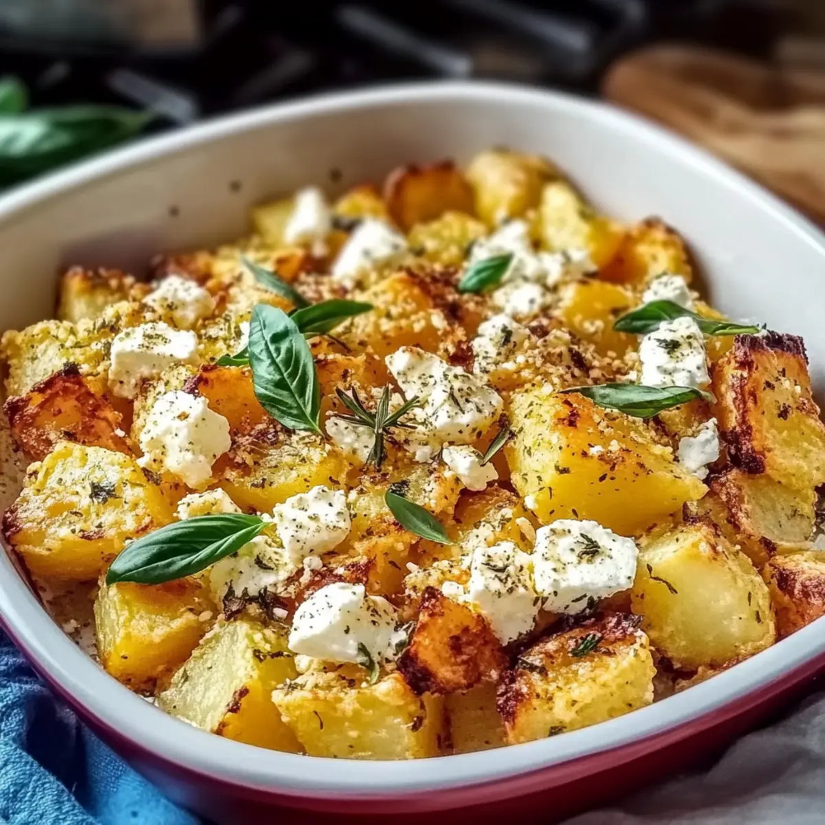 - Crumble feta cheese generously over the potatoes.