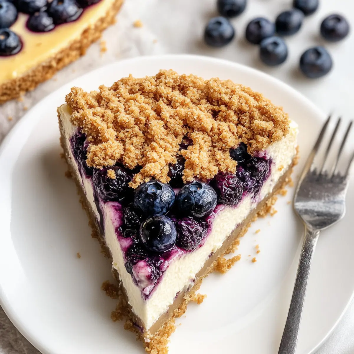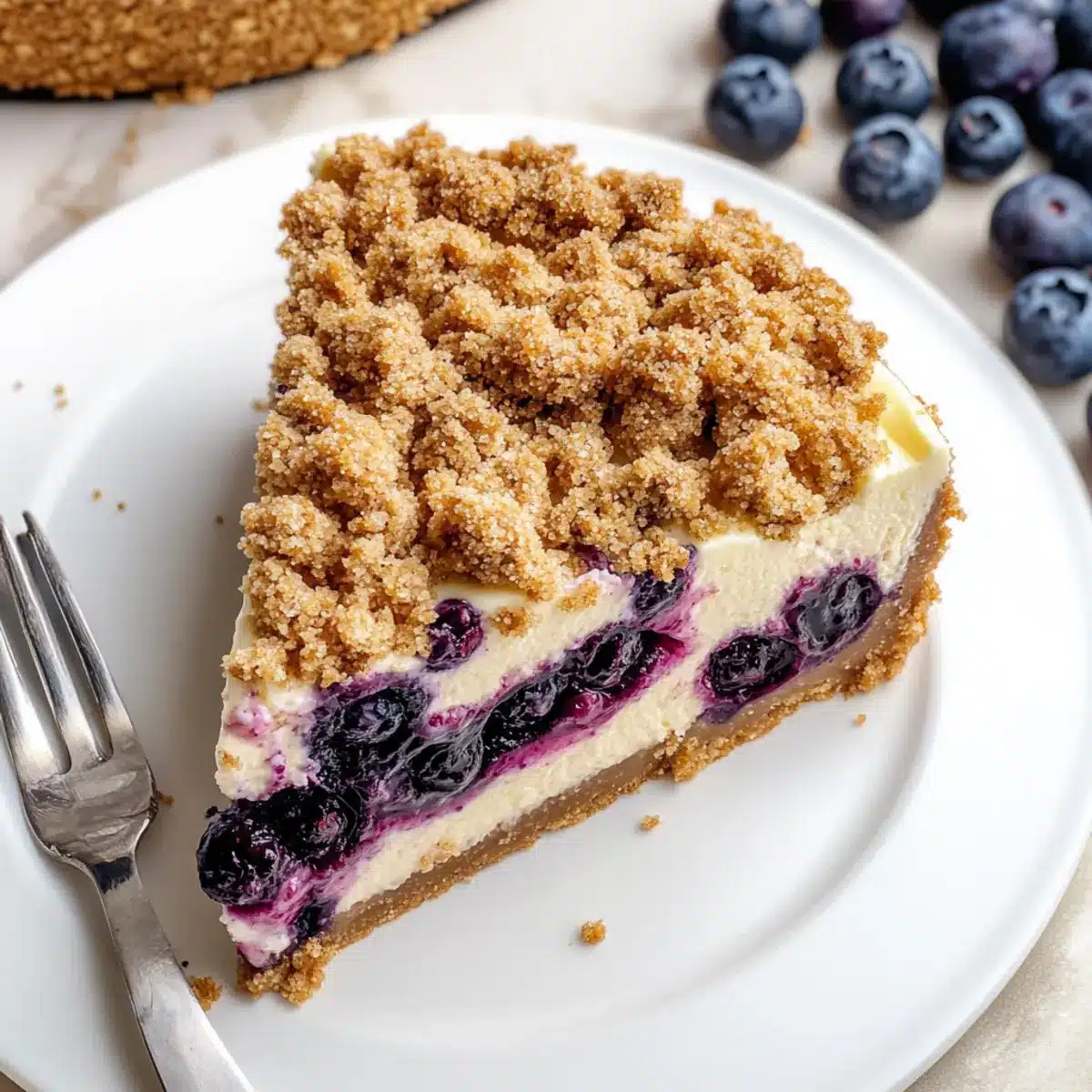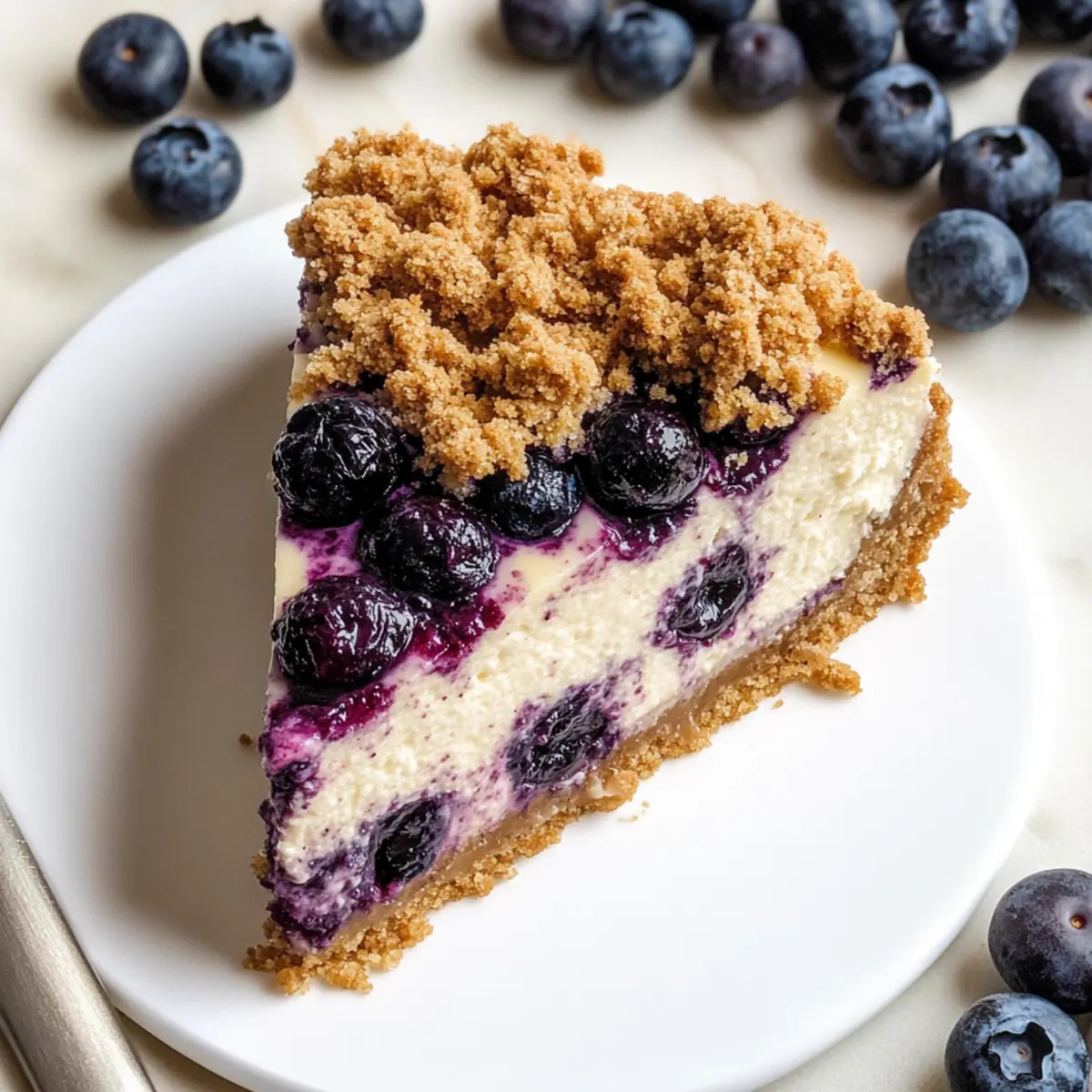There’s a vibrant summer scene in my mind: a picnic blanket spread on the grass, sunshine filtering through the trees, and laughter filling the air. Among the warm, bright colors of fresh fruits, my Blueberry Crumble Cheesecake takes center stage, capturing the moment perfectly. This dessert is not just a treat; it’s an experience, featuring a delectable crumbly cookie crust, a lusciously creamy filling, and the tangy burst of blueberries that bring it to life. Ideal for both casual gatherings and intimate evenings, this Blueberry Crumble Cheesecake is a crowd-pleaser that satisfies sweet cravings without hours in the kitchen. Plus, you can make it a day ahead for even better flavor! Are you ready to create a delightful masterpiece that will impress your friends and family? Let’s dive into this delicious recipe together!