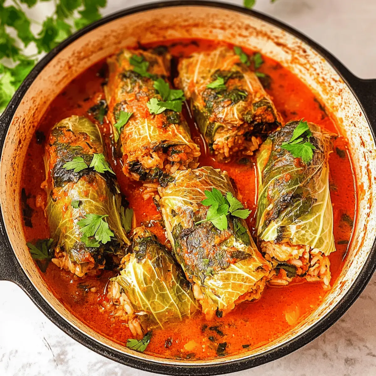 Preheat your oven to 350°F (180°C). Pour some of the prepared sauce at the bottom of a large casserole dish, then layer the cabbage rolls on top. Add a couple of bay leaves for aromatic flavor. Pour the remaining sauce over the rolls, cover the dish with foil, and bake for 90 minutes. Remove the foil for the last 30 minutes to let the rolls brown slightly.