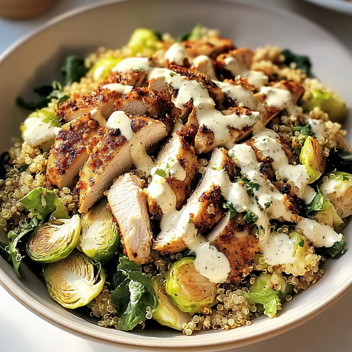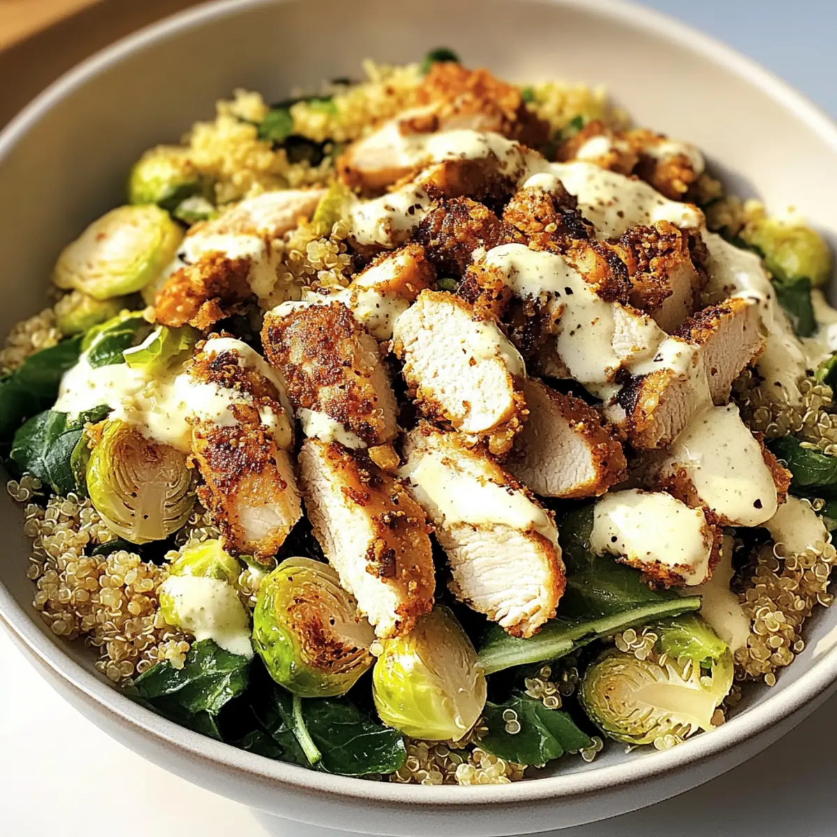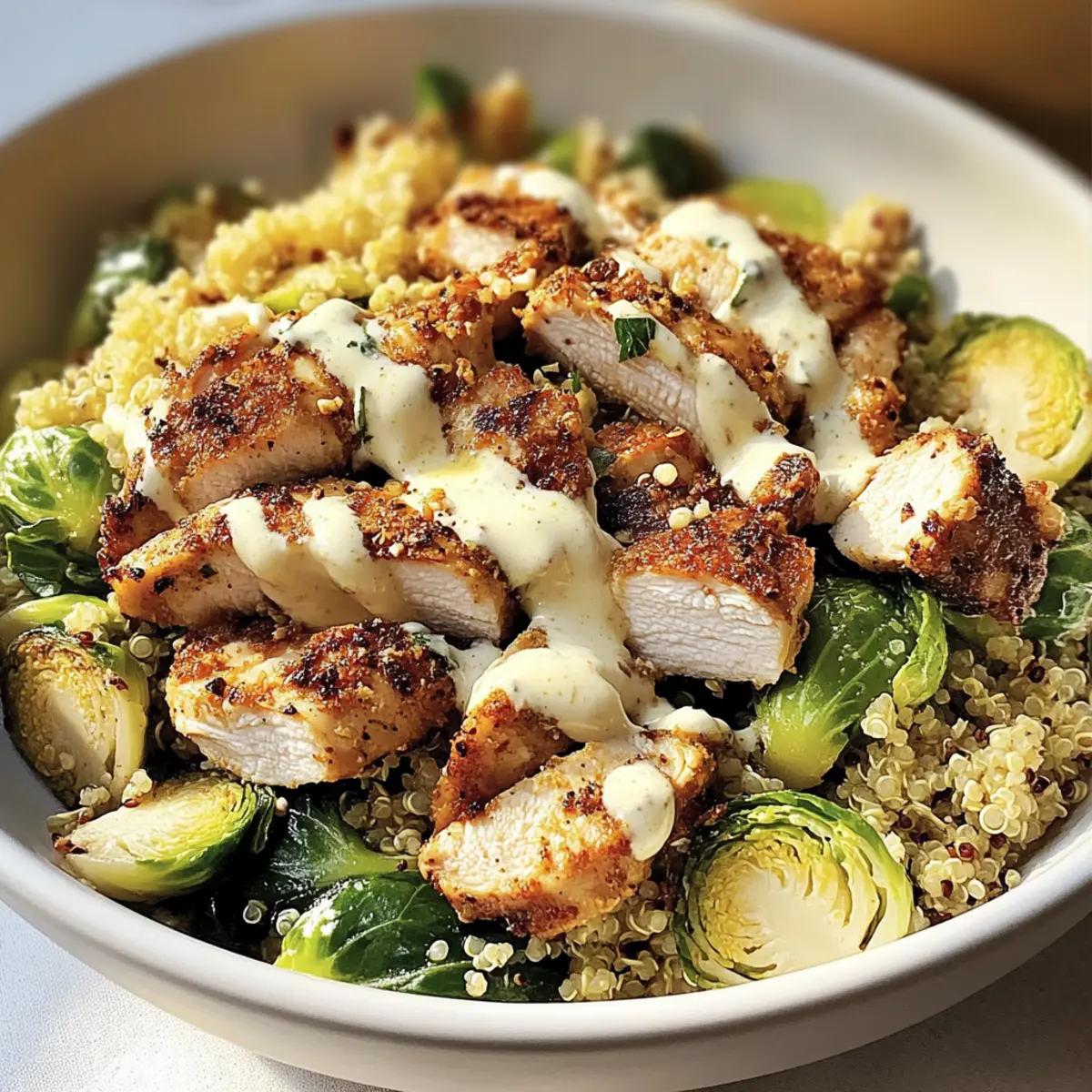 - Combine sautéed Brussels sprouts with dressing, then fold in chopped chicken and crunchy quinoa.