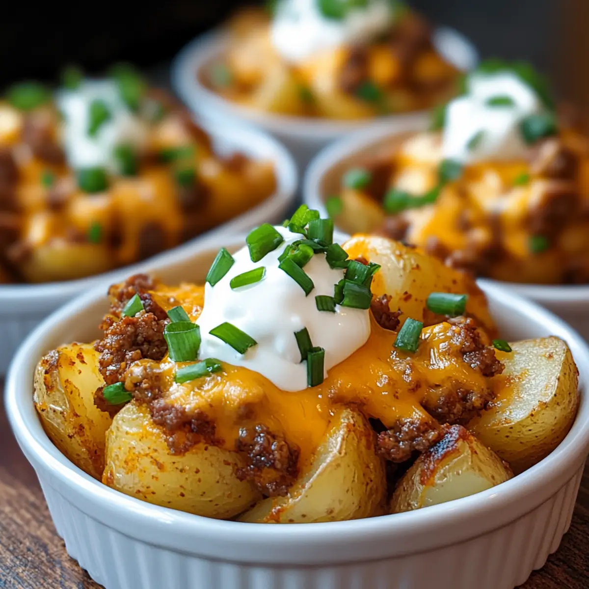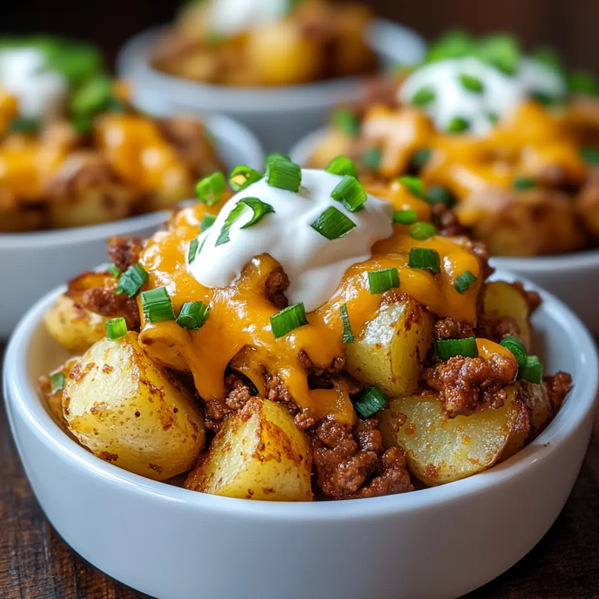 Remove the dish from the oven and let it sit for a moment. Top your Cheesy Taco Potatoes with sour cream, chopped green onions, and any extra toppings of your choice, such as diced tomatoes or jalapeños. Serve hot, inviting everyone to dig in and customize their plates for a fun, delicious meal.