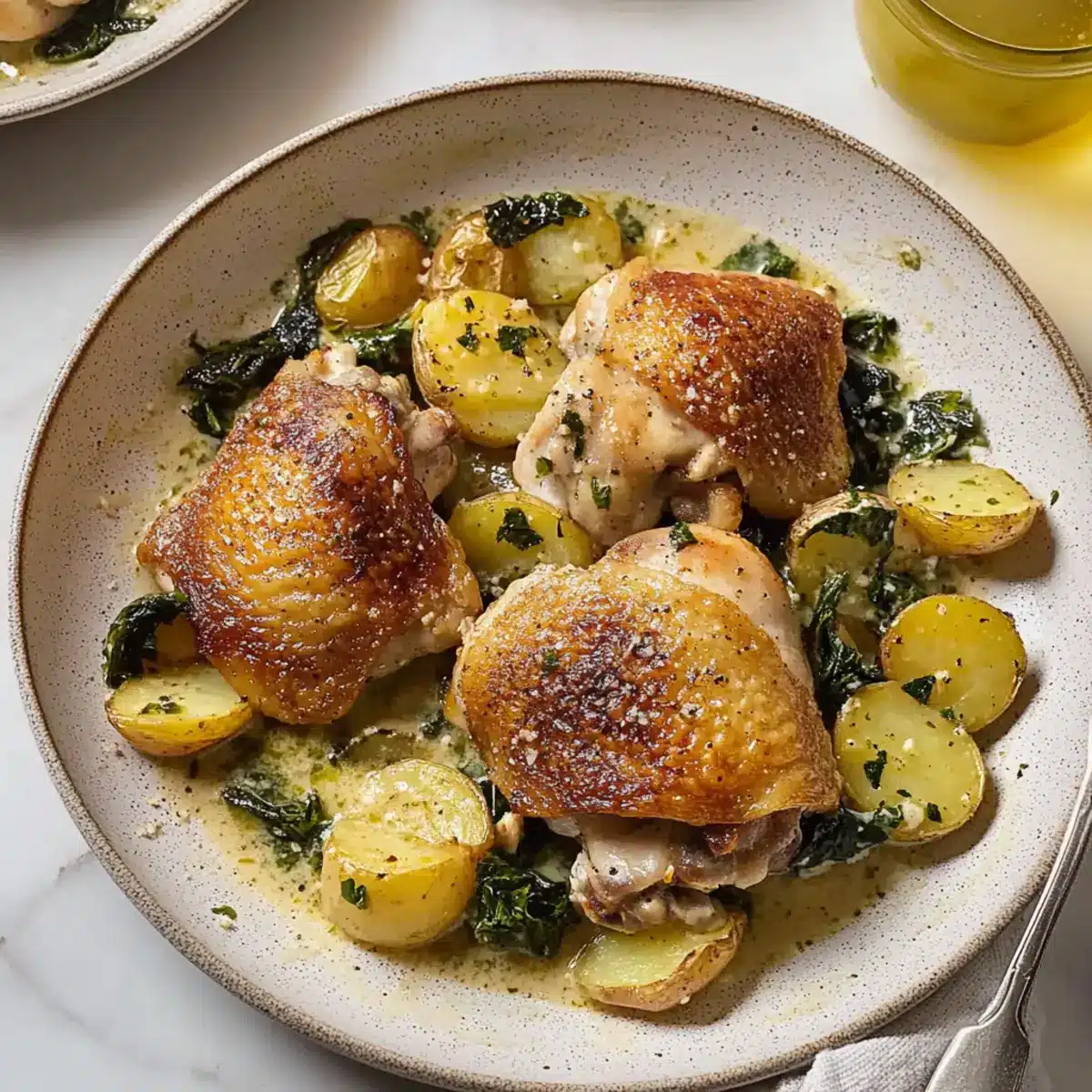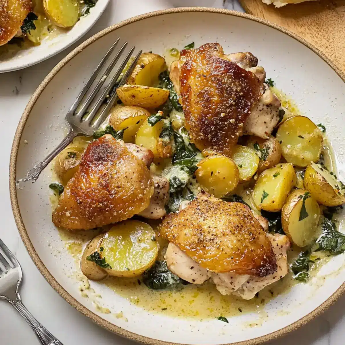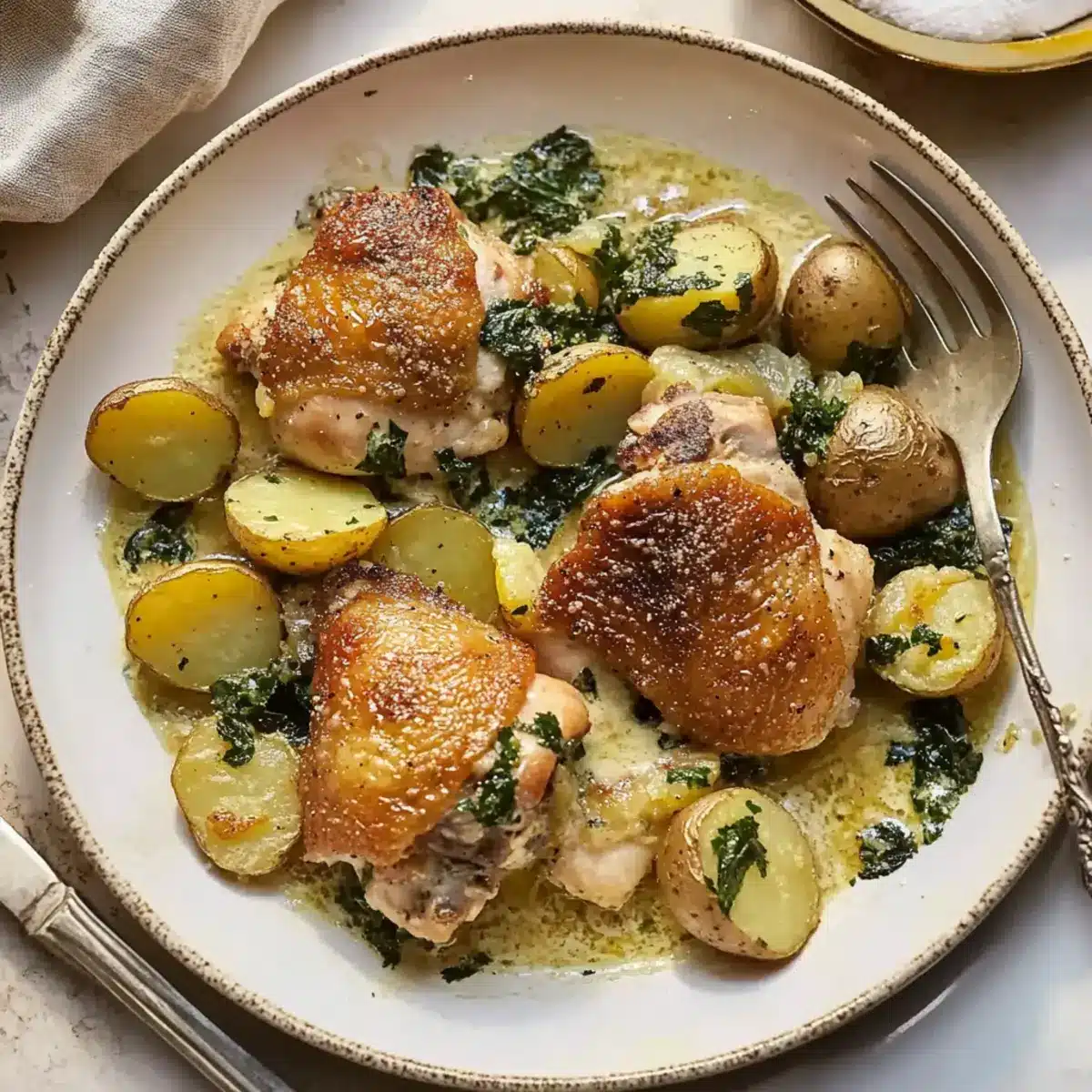 - In the prepared baking dish, arrange the seared chicken thighs, layer the halved potatoes around, add wilted spinach, and pour the creamy sauce over everything.