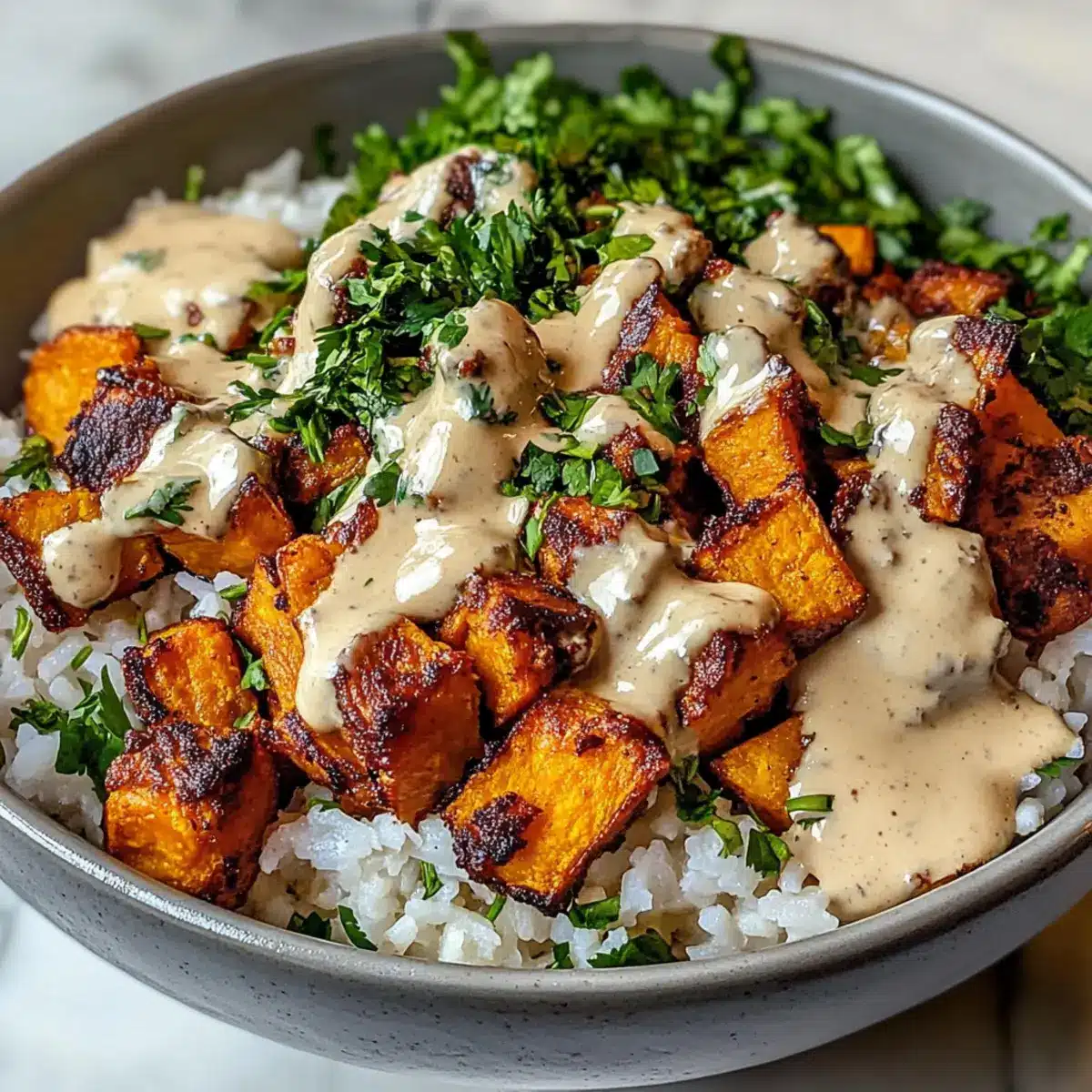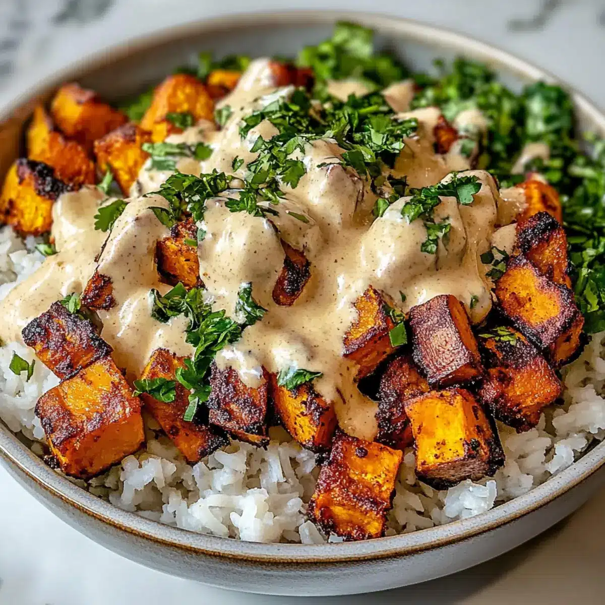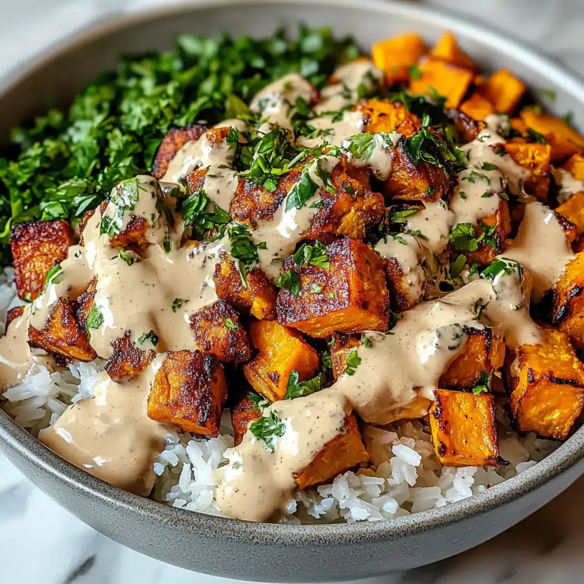 - Drizzle the creamy spiced sauce over each bowl and garnish with fresh cilantro or parsley. Serve immediately.
