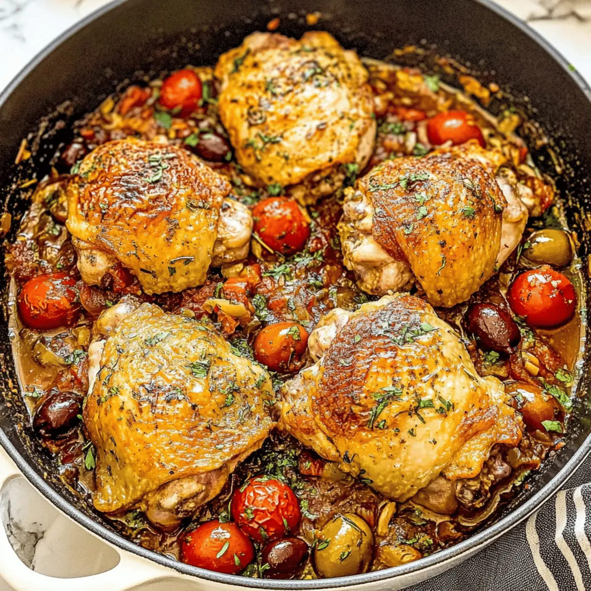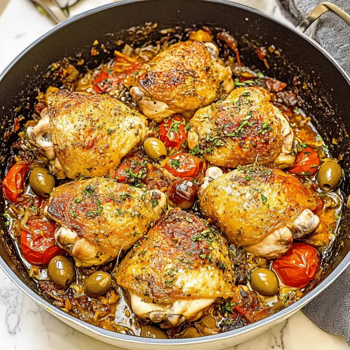Return the seared chicken thighs to the skillet. Add ½ cup chicken broth, ½ cup pitted green olives, and 2 tablespoons rinsed capers to the mix. Bring everything to a gentle simmer, cover, and cook for 25-30 minutes. The chicken should be thoroughly cooked and tender, soaking up all the delightful flavors of your Chicken Provençal.