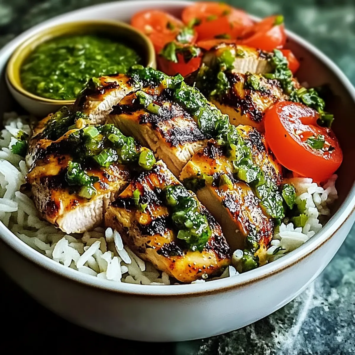 - Assemble Bowls: Place rice or greens as a base in each bowl, slice the chicken, lay it over the base, drizzle chimichurri sauce, and add garlic sauce on top.