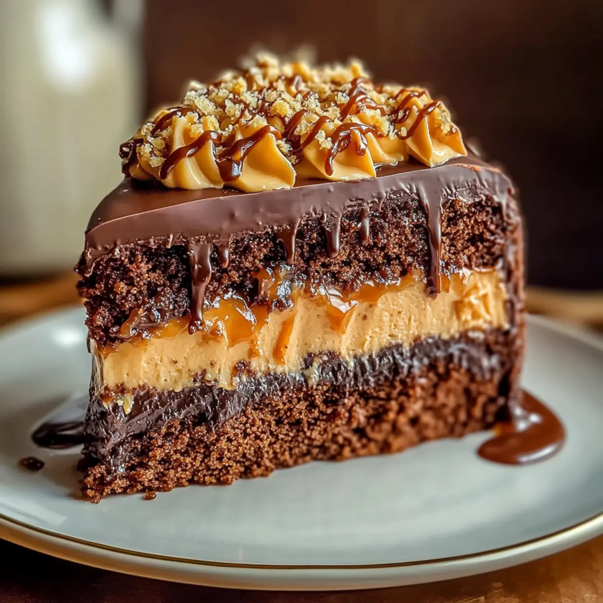 Decadent layers: Moist chocolate cake interlaced with creamy caramel and crunchy toffee creates a harmonious dessert experience.
