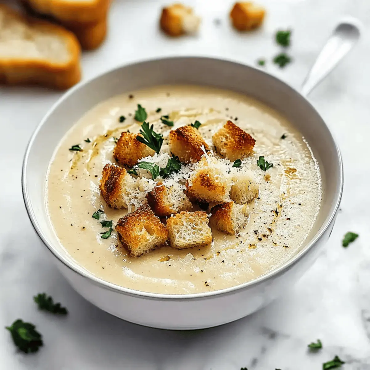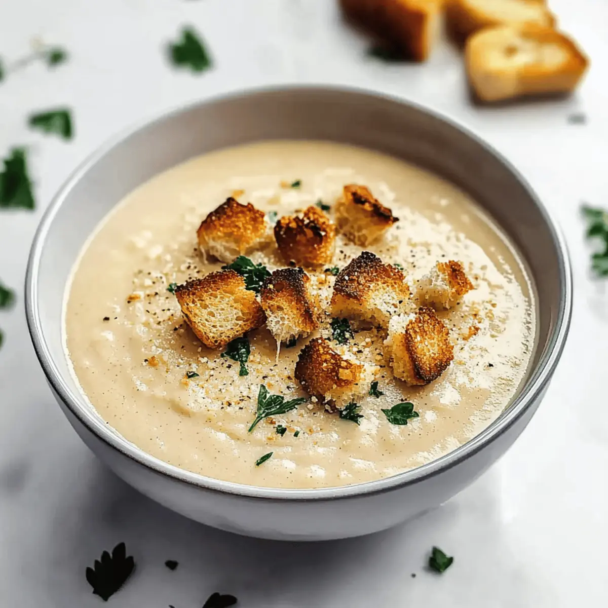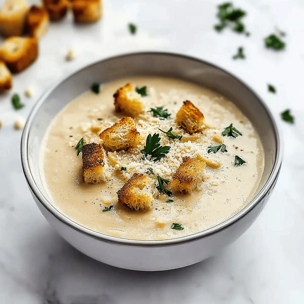 Finally, serve your delicious Classic Garlic Soup hot in bowls. Top with mini soup croutons for added crunch, a sprinkle of chopped fresh parsley for a burst of color, and perhaps a bit more grated Parmesan cheese. This comforting soup is sure to warm you up on any chilly evening, making it a delightful centerpiece for your dinner table.