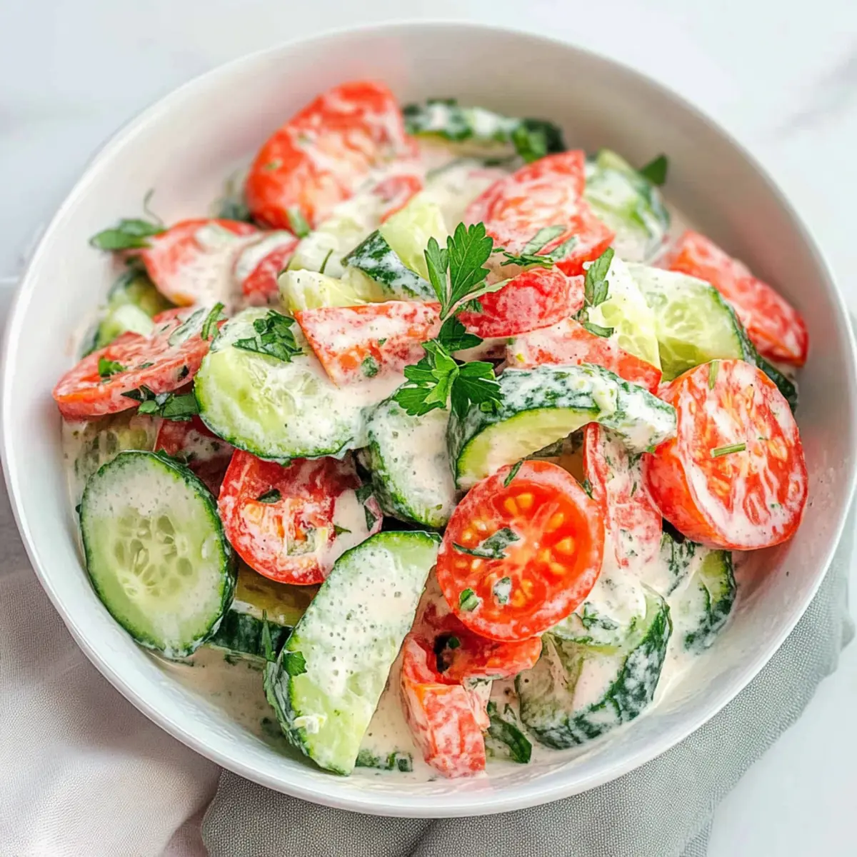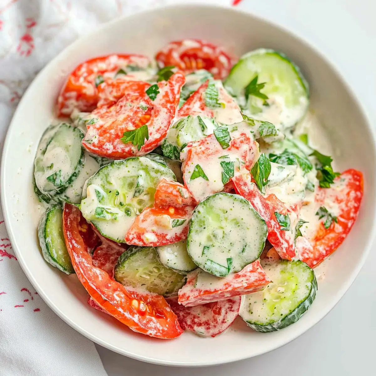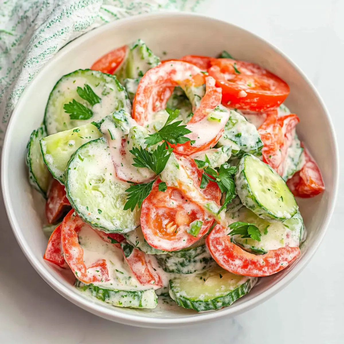 Fresh Ingredients: Using fresh cucumbers and tomatoes will elevate the taste of your Creamy Cucumber and Tomato Salad, creating the perfect summer dish.