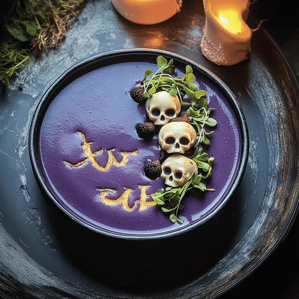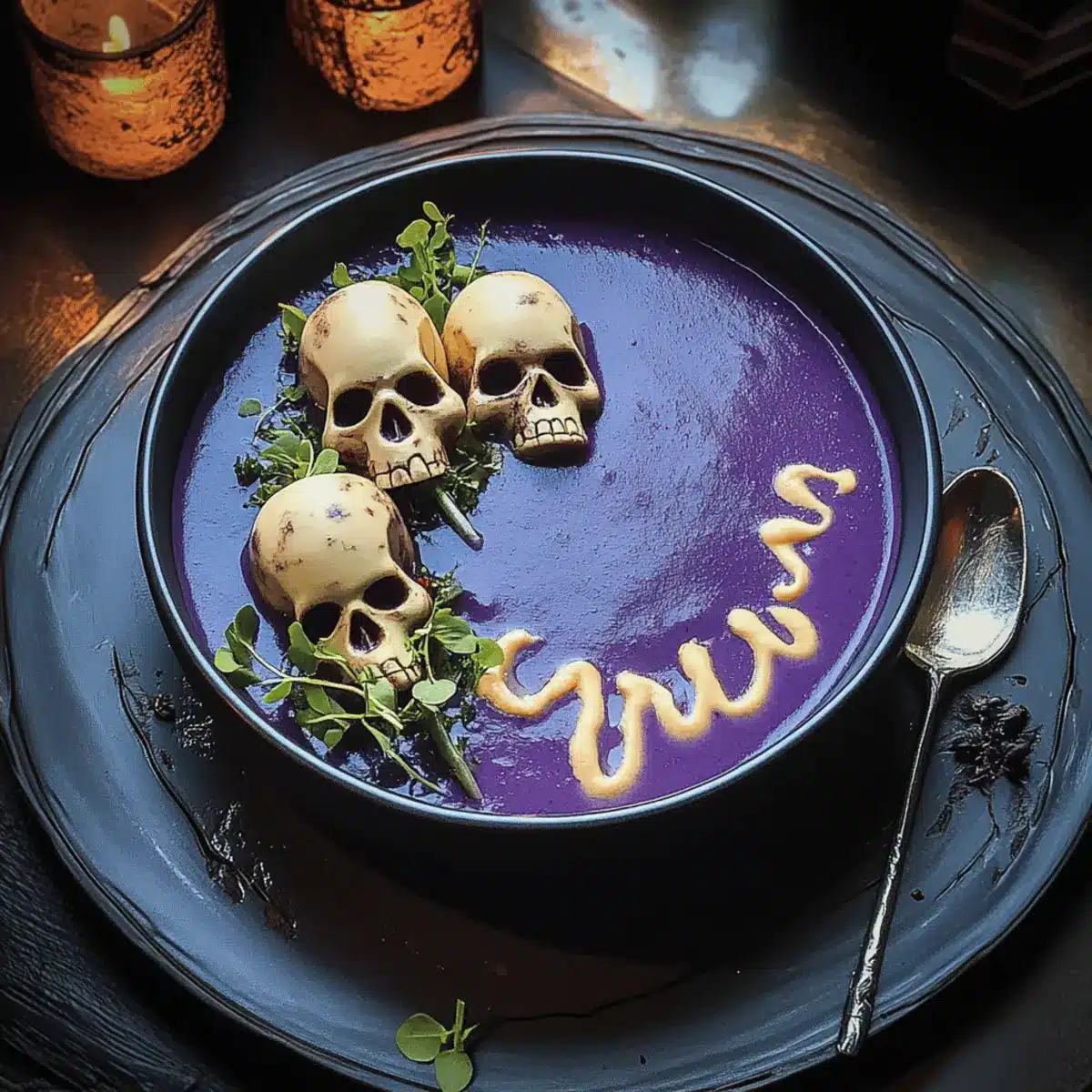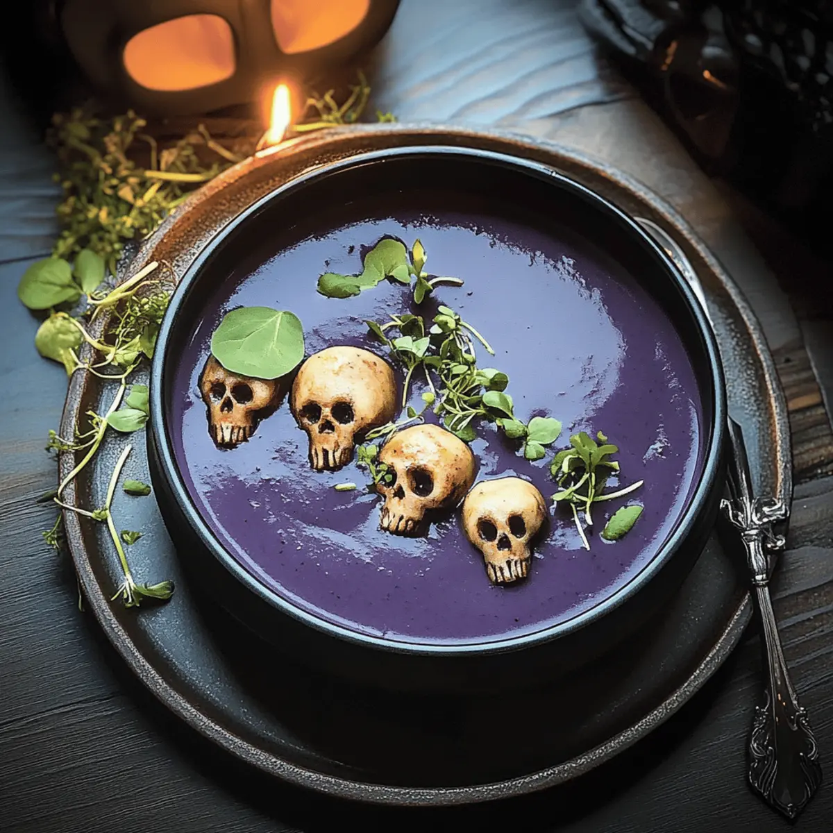 Creamy Purple Potato Soup with Skull Mushrooms for Halloween Fun