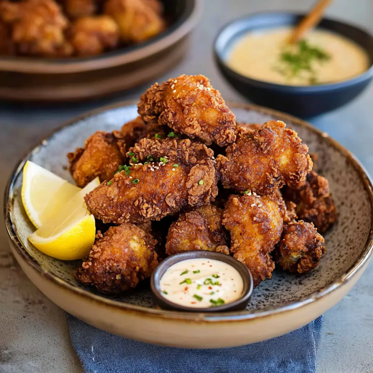 Serve your Crispy Chicken Karaage immediately while hot, accompanied by lemon wedges and a side of wasabi mayo for dipping. This delectable dish is perfect for sharing and is sure to delight your family and friends, showcasing the irresistible flavors of traditional Japanese cuisine.