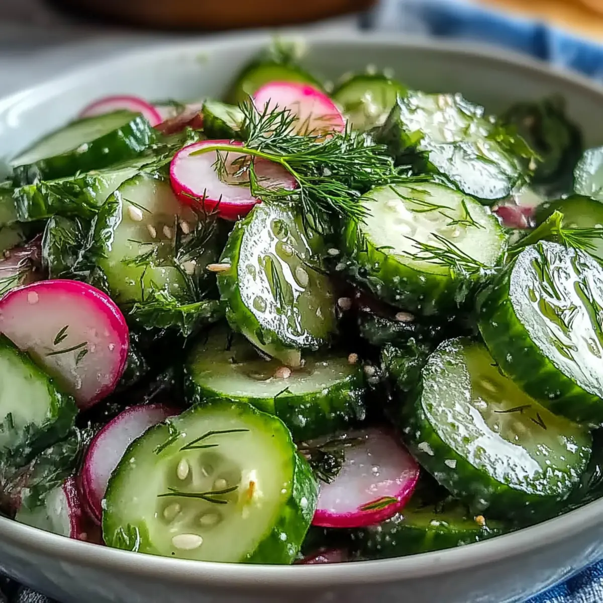 As I sliced through the crisp cucumbers and the vibrant radishes, I was transported to the sunny streets of a bustling farmers’ market. This Cucumber Radish Dill Salad is the perfect ode to freshness, bringing together the crunch of garden-fresh vegetables enveloped in a light, zesty vinaigrette. With just 15 minutes of preparation, it easily fits into a busy weeknight routine and stands out as a delightful complement to any grilled dishes. It’s not just a salad; it’s a refreshing escape that’s equally delicious on a picnic blanket or served alongside a hearty dinner. Curious how to elevate your next meal without the fuss? Let’s dive into this simple yet satisfying recipe!