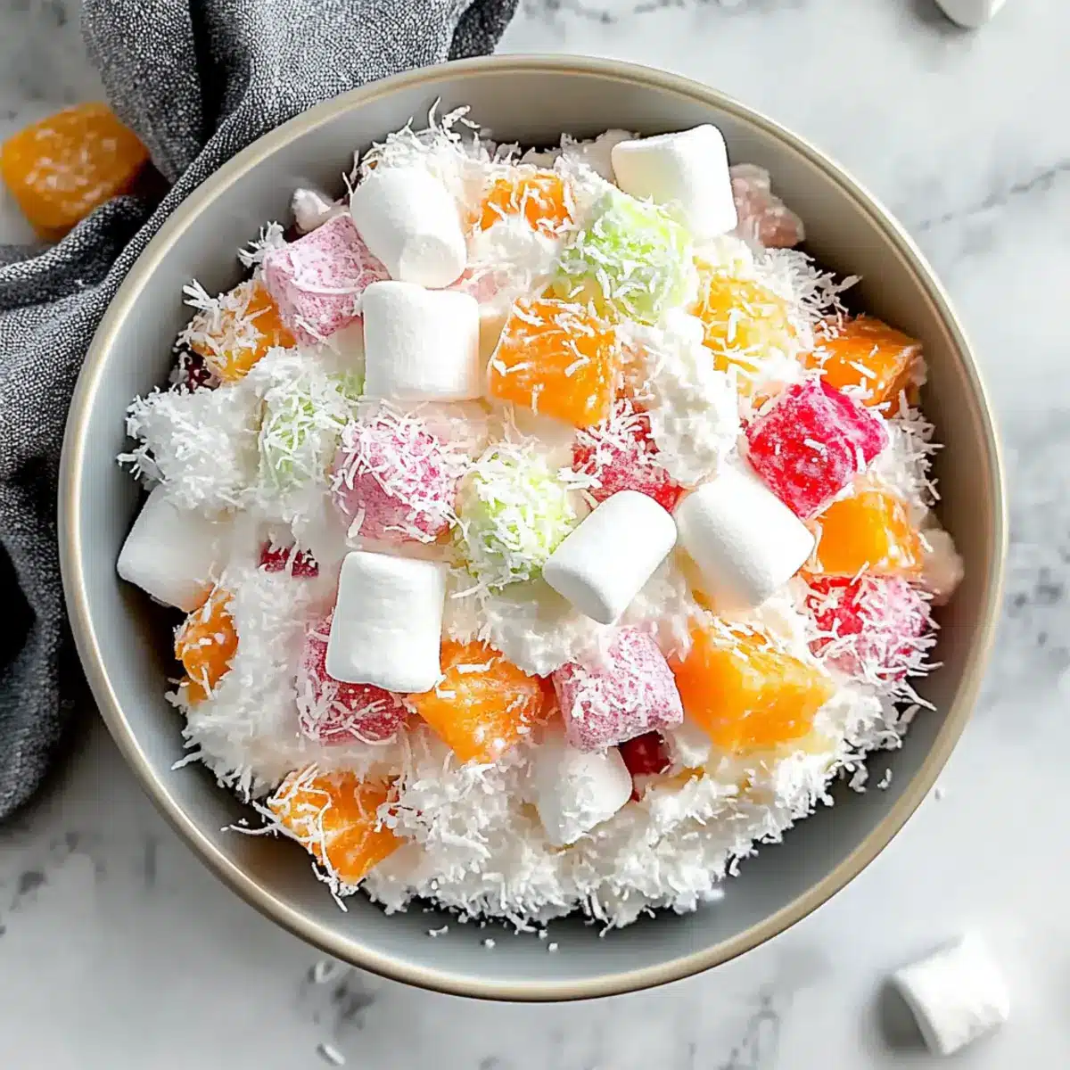 In a separate bowl, combine your prepared fruits with marshmallows and coconut flakes. This mixture adds sweetness and texture to your salad. Ensure that your fruits are evenly coated, and be ready to gently fold this mixture into the creamy base after it’s combined well.