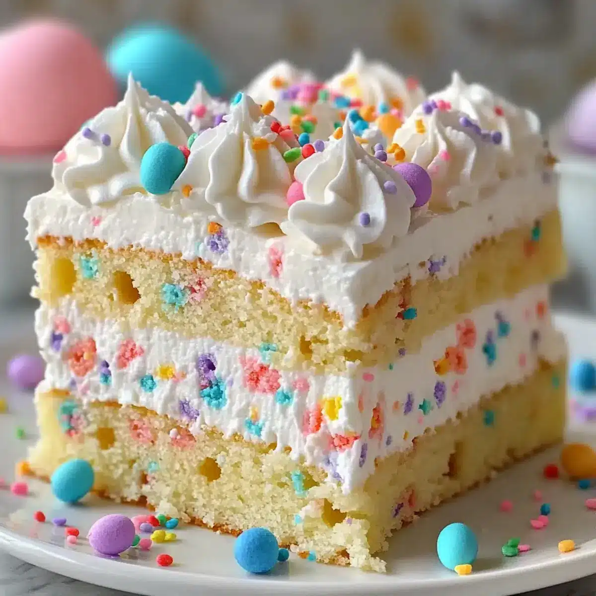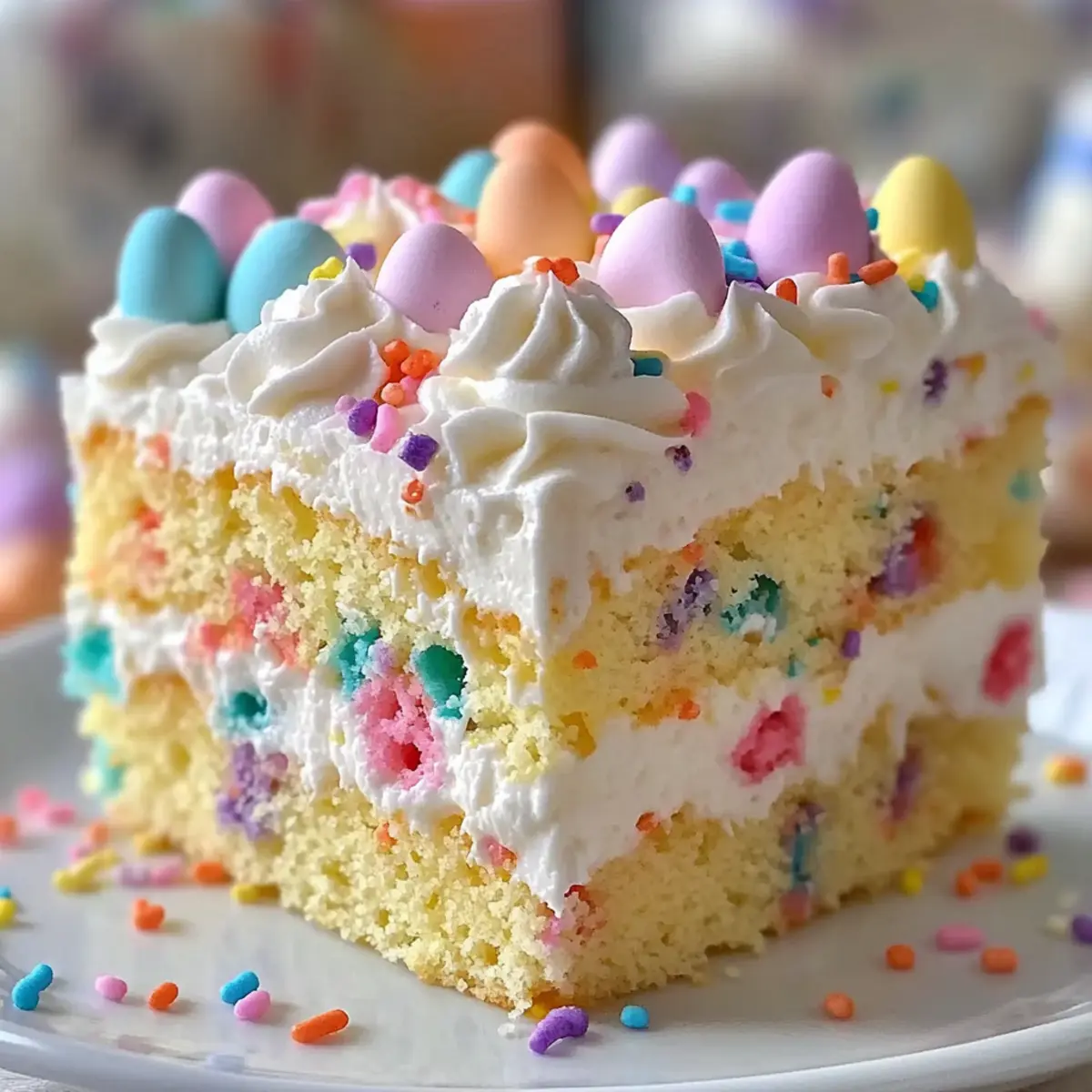 - Top with pastel sprinkles or Easter candies. Slice and serve.