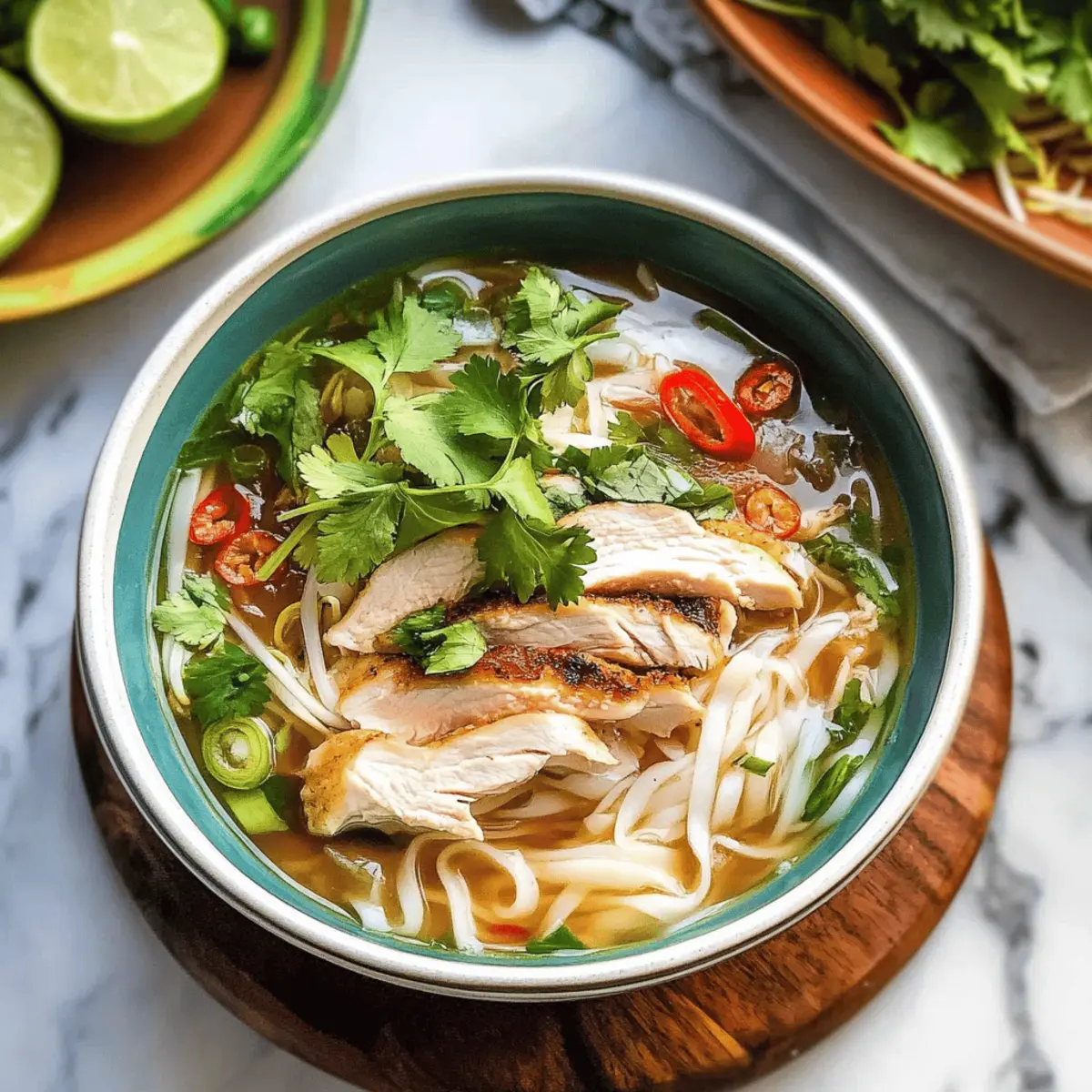 To serve your Easy Pho, place a generous amount of cooked noodles in each bowl. Ladle the hot broth with chicken over the noodles, ensuring everyone gets a few pieces of chicken. This comforting presentation allows the broth to soak into the noodles beautifully, creating a warm and inviting dish ready to enjoy.