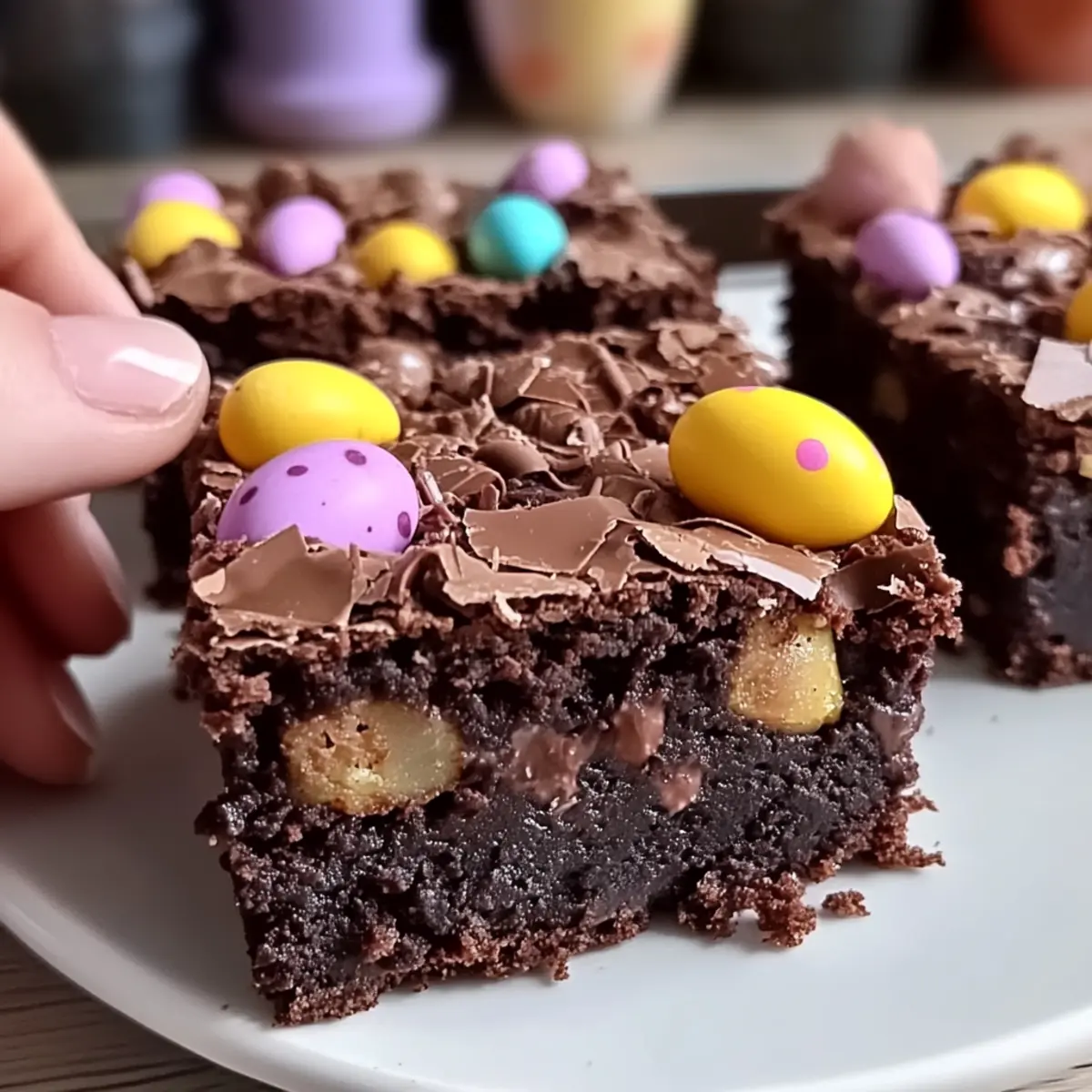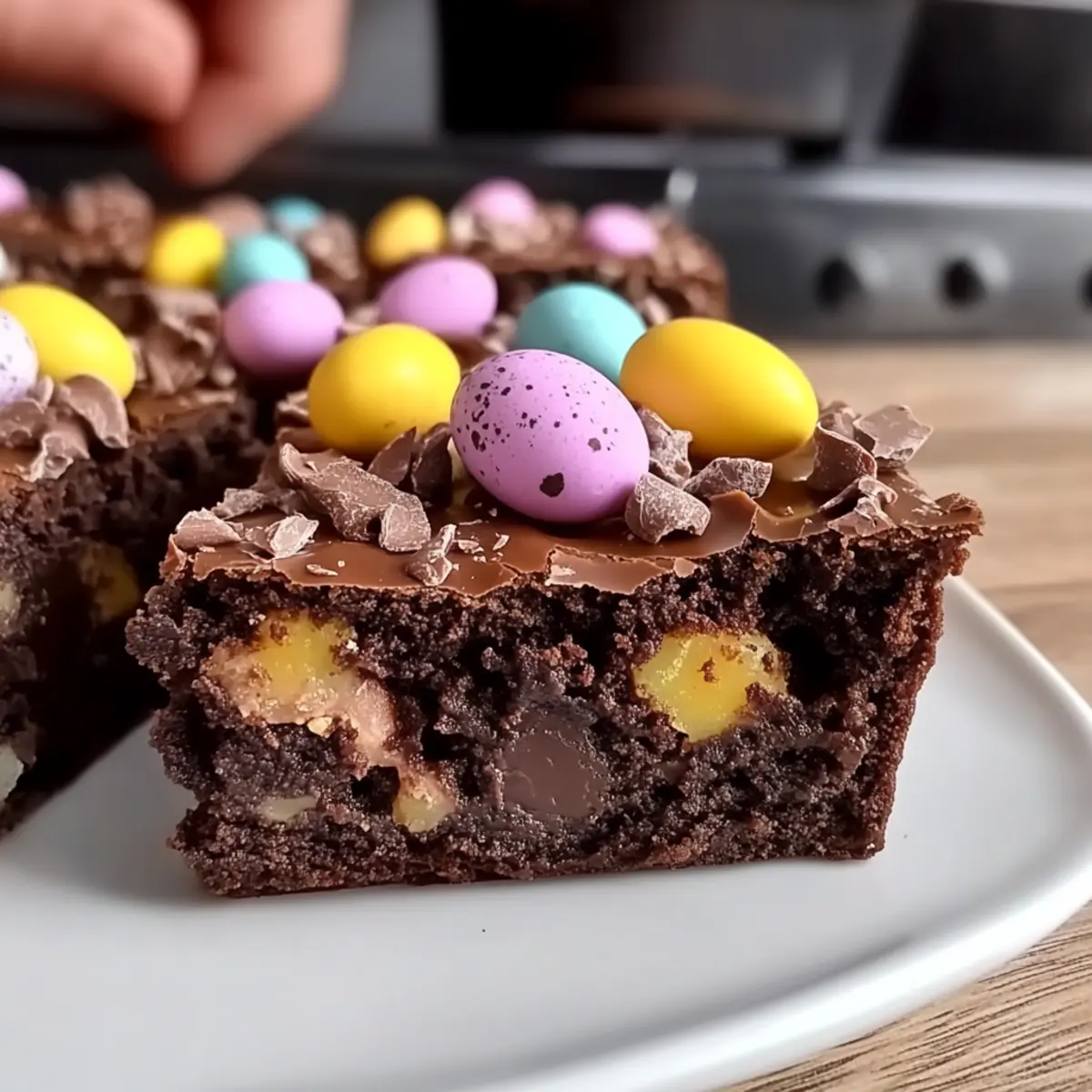 - Sprinkle the reserved mini chocolate eggs on top and allow the brownies to cool at room temperature.
