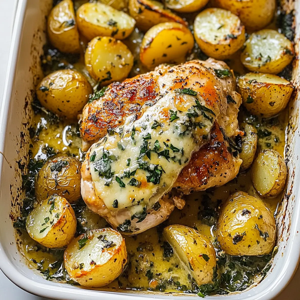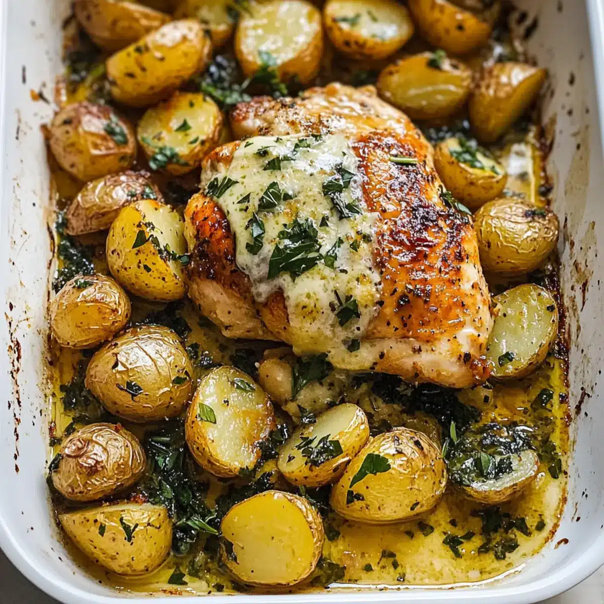 - Drizzle sauce over chicken and potatoes, garnish with extra Parmesan and parsley, and serve warm.