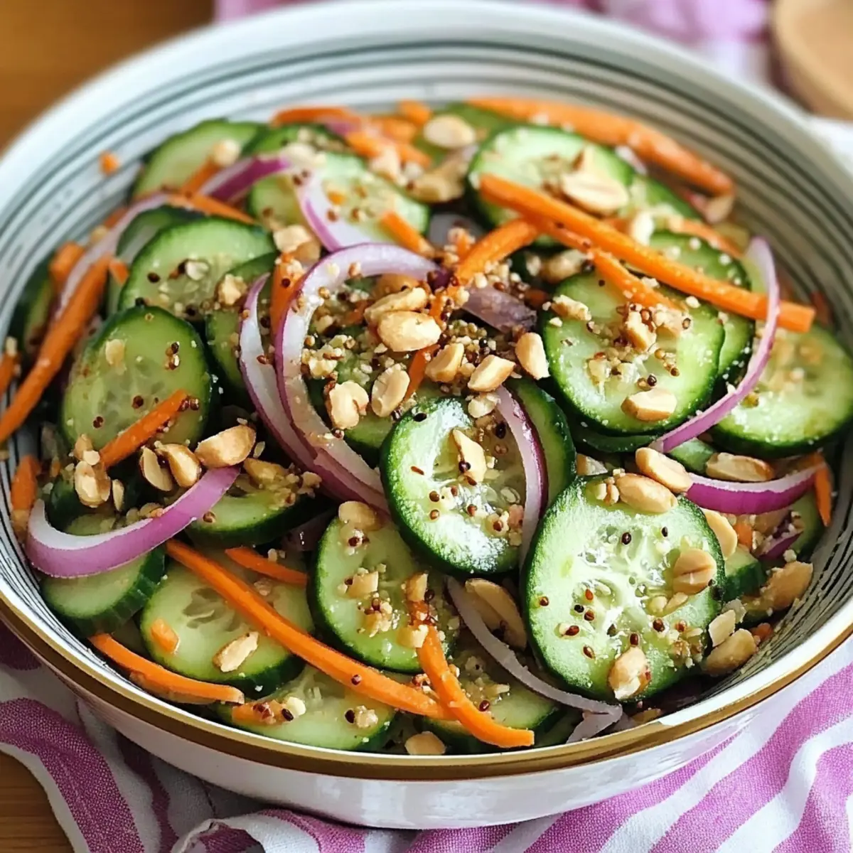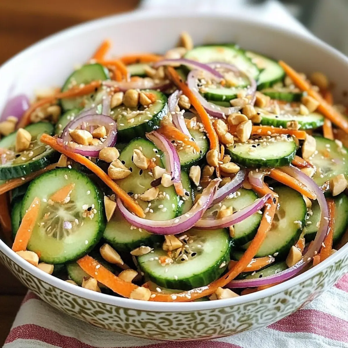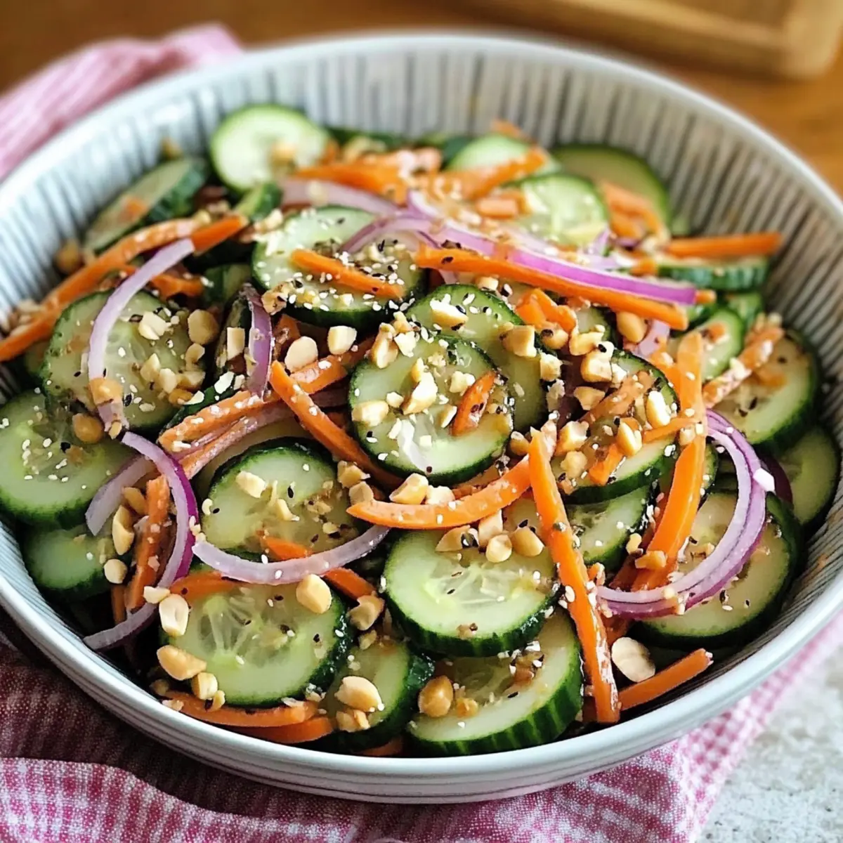 Slice Thinly: Thin slices of cucumber and carrots allow better absorption of the bold dressing. Avoid chunkier cuts; they can overwhelm the salad’s delicate balance.