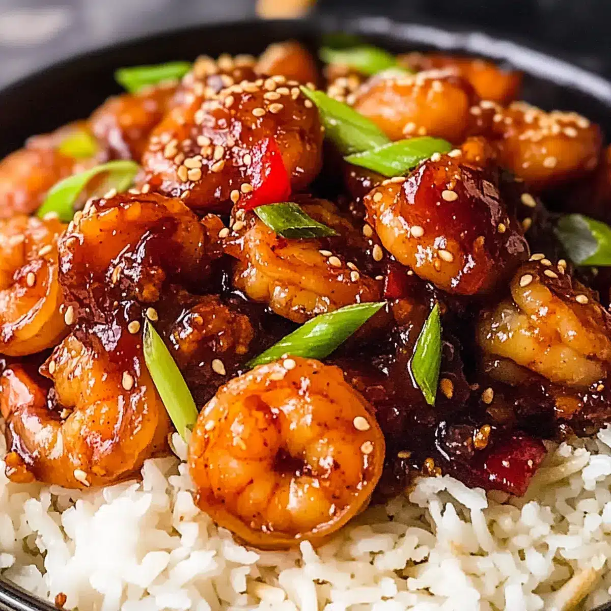 - Transfer the General Tso Shrimp Stir Fry to a serving platter and garnish generously with sesame seeds and scallions. Serve immediately.