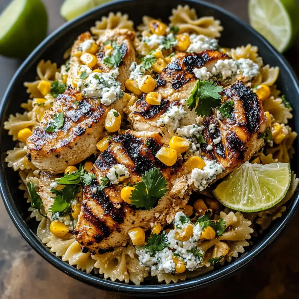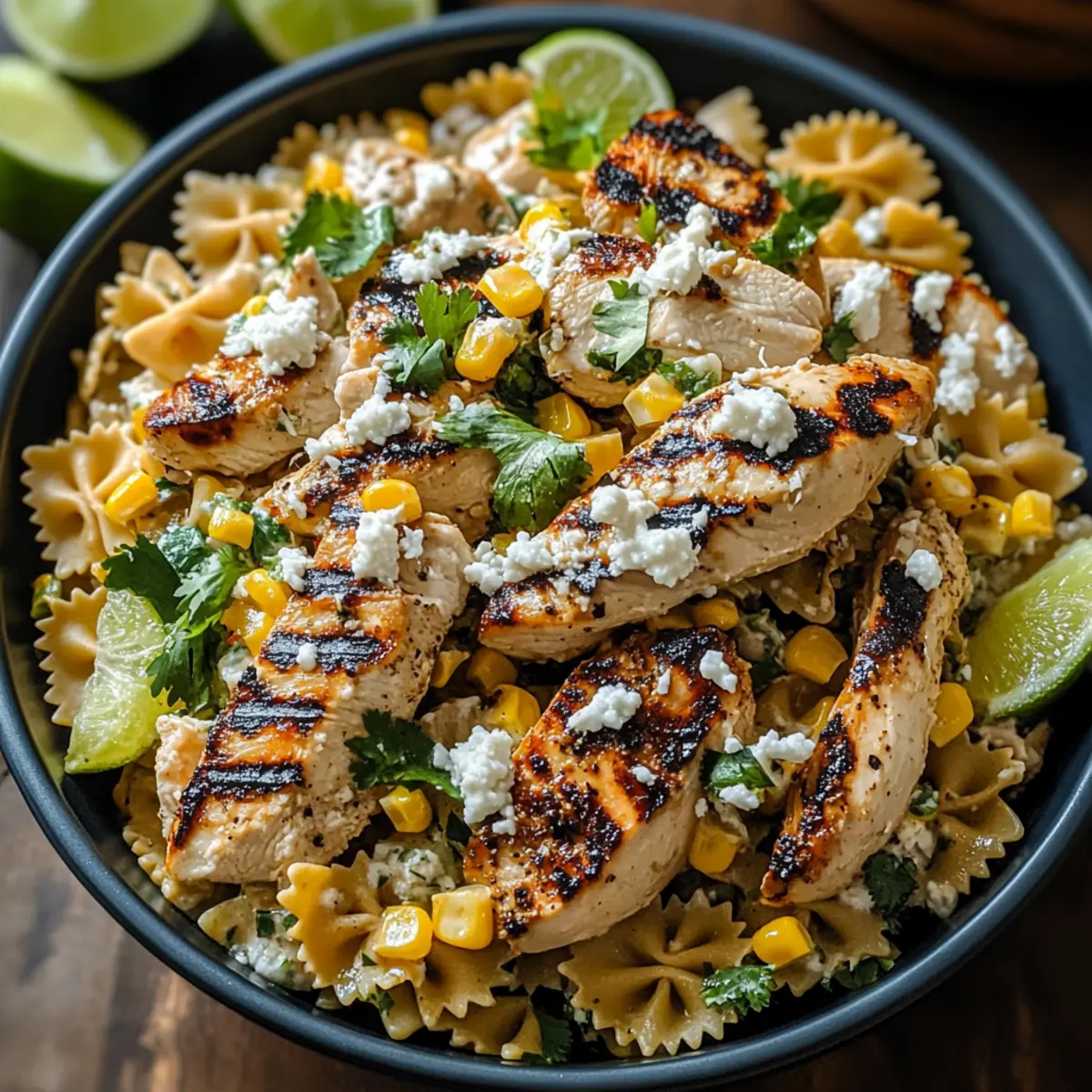 Transfer the Grilled Chicken & Street Corn Pasta Salad to a serving bowl. Garnish with freshly chopped cilantro and lime wedges for an extra touch of freshness. This vibrant salad is now ready to impress at your summer BBQ or potluck!