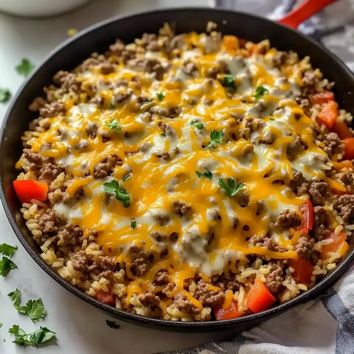 These Ground Beef and Rice Skillet Dinner components are perfect for meal prep enthusiasts! You can brown the ground beef and sauté the onion, bell pepper, and garlic up to 24 hours in advance, storing them in an airtight container in the refrigerator. Additionally, you can measure and combine the rice, diced tomatoes, and beef broth to save time during the cooking process. When you’re ready to serve, simply heat the prepped ingredients in the skillet, add the rice mixture, and bring it to a boil. Cover and allow it to simmer until the rice is fluffy and tender, ensuring a strategically saved weeknight dinner that tastes just as delicious!