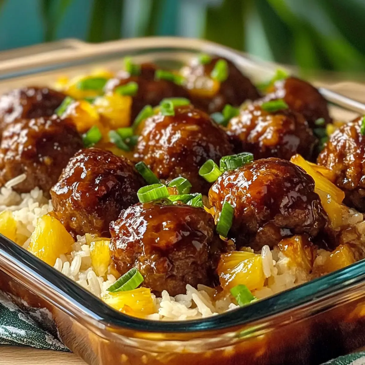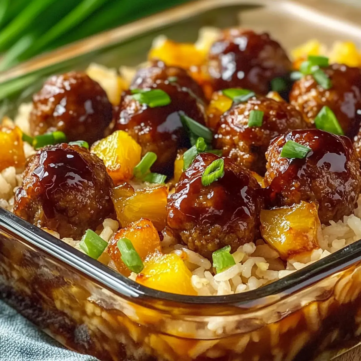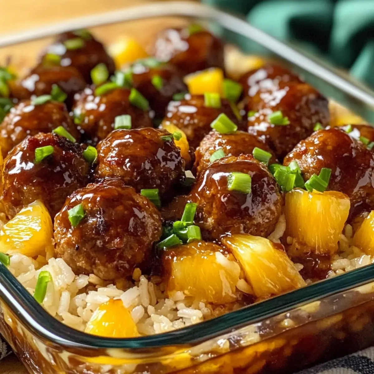 - Spread rice in a baking dish. Arrange meatballs on top, scatter pineapple chunks, and drizzle glaze over.