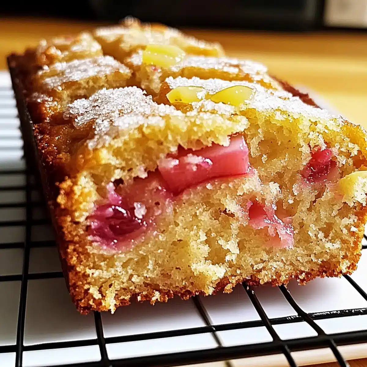 Berry Swap: Substitute rhubarb with strawberries for added sweetness and a pop of color. This luscious swap can elevate your loaf’s appearance, inviting everyone to take a slice!