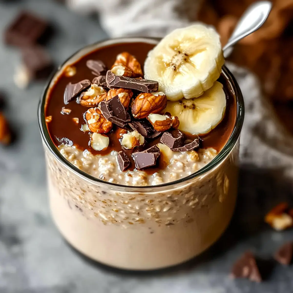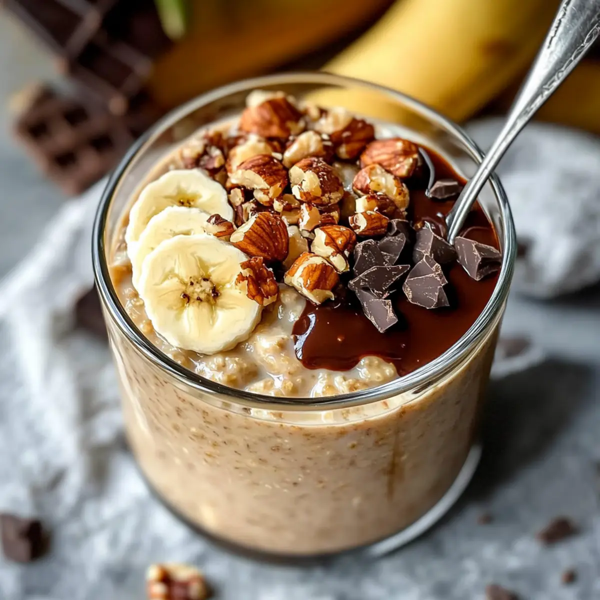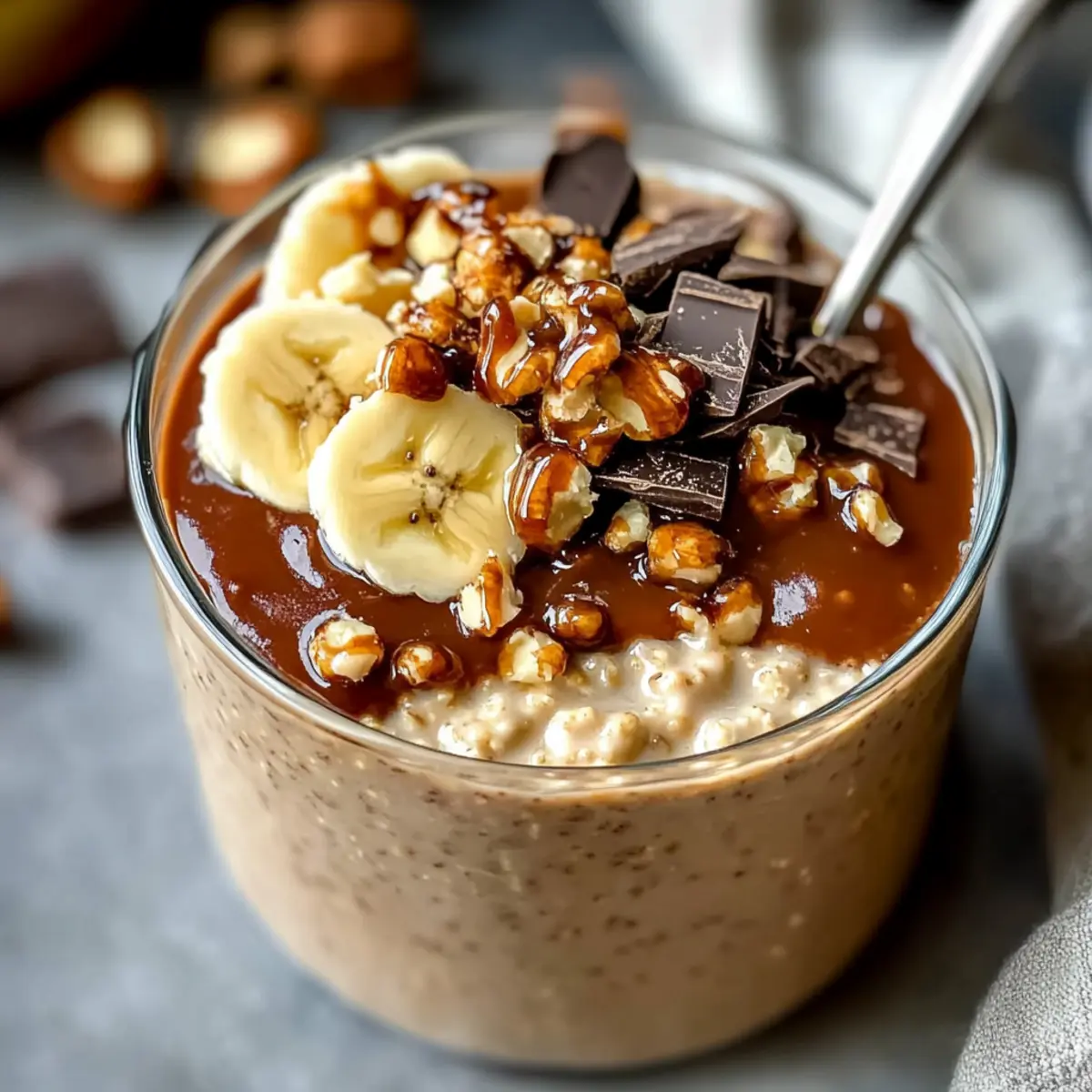 Now, it’s time to customize your oats! Top your creamy mixture with a generous spoonful of hazelnut or chocolate spread, and then sprinkle chopped praline nuts for that delightful crunch. Sliced banana and dark chocolate shavings are delicious options that can elevate the flavors even further.