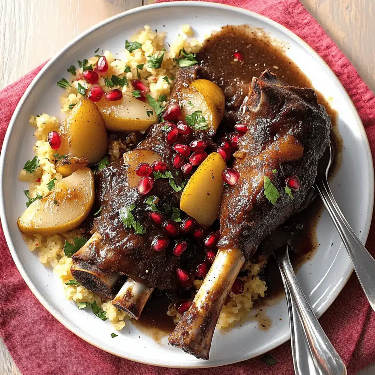 These Pear and Pomegranate Lamb Tagine are perfect for busy home cooks who want to savor a delicious meal without the last-minute rush! You can prepare the lamb shanks, chopped pears, and sliced shallots up to 24 hours in advance; simply layer them in the slow cooker and cover tightly with plastic wrap to prevent any browning. Additionally, mix your orange juice, pomegranate juice, honey, and spices ahead of time and store them in the refrigerator. When you’re ready to enjoy this hearty dish, just pour the prepared mixture over the lamb, set the slow cooker to low heat for 6-8 hours, and relish the mouthwatering results with minimal effort!