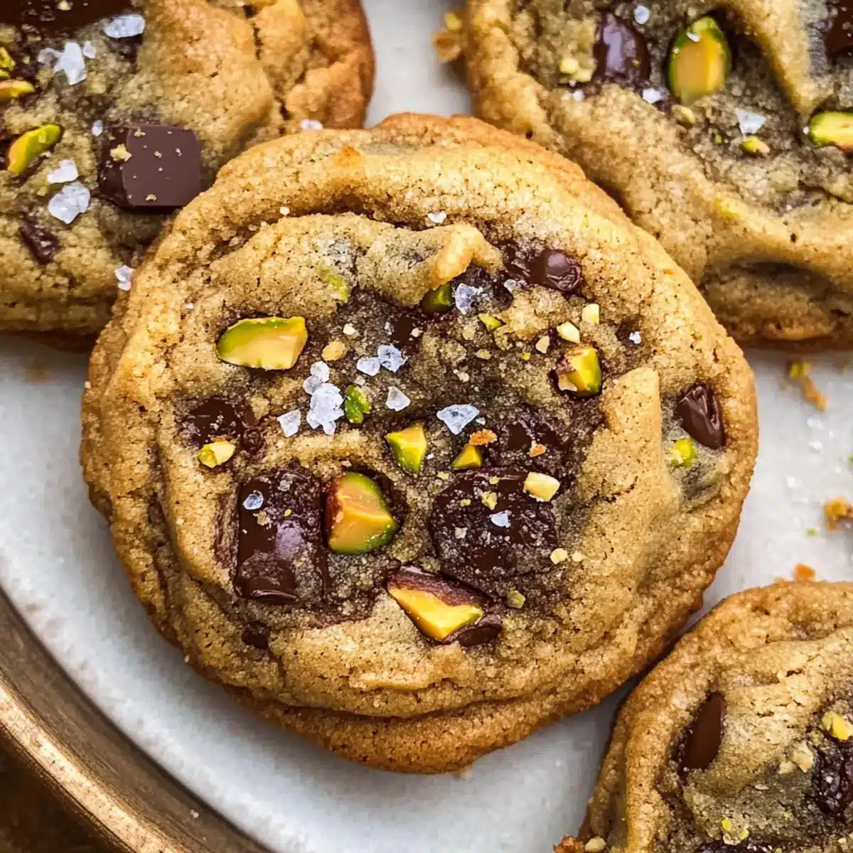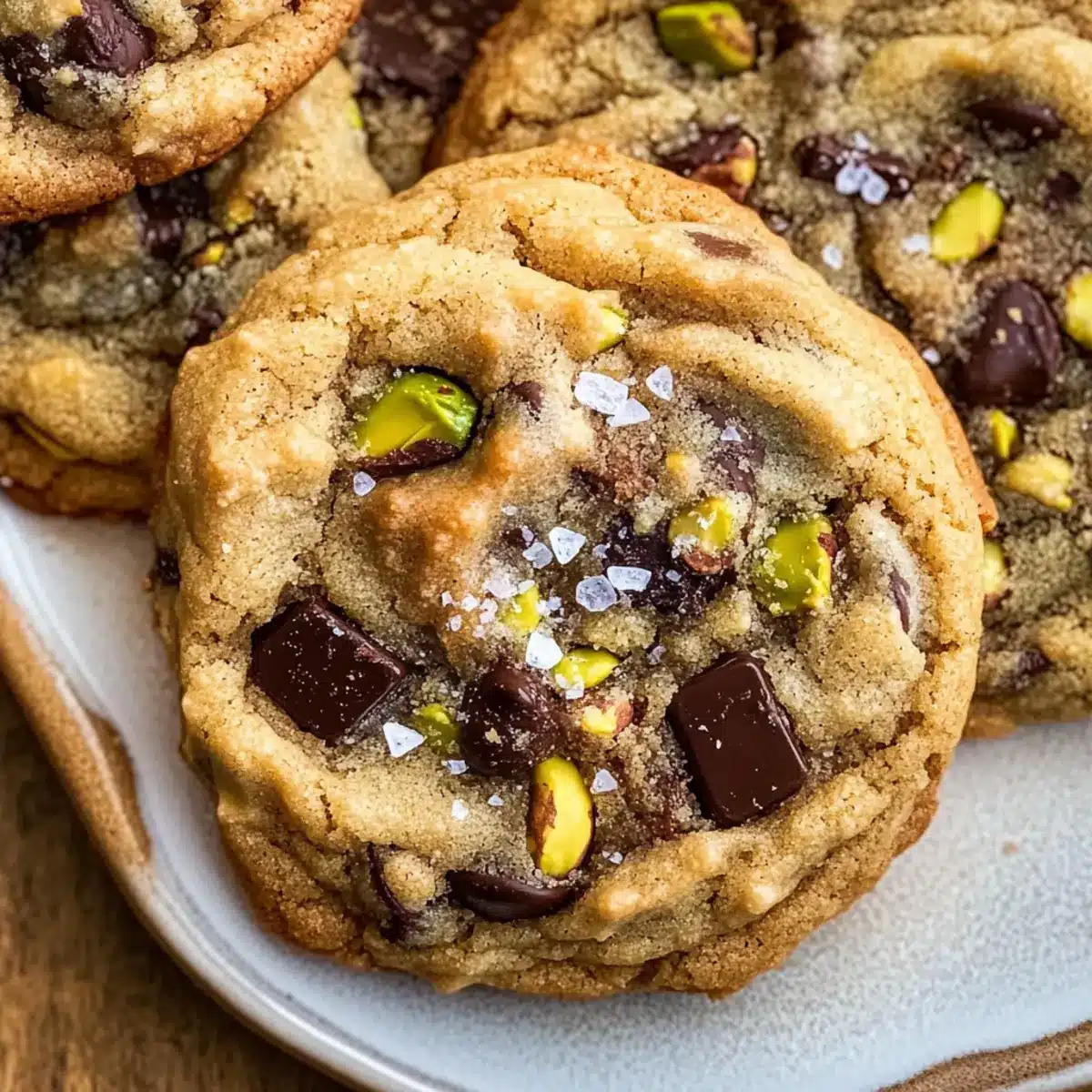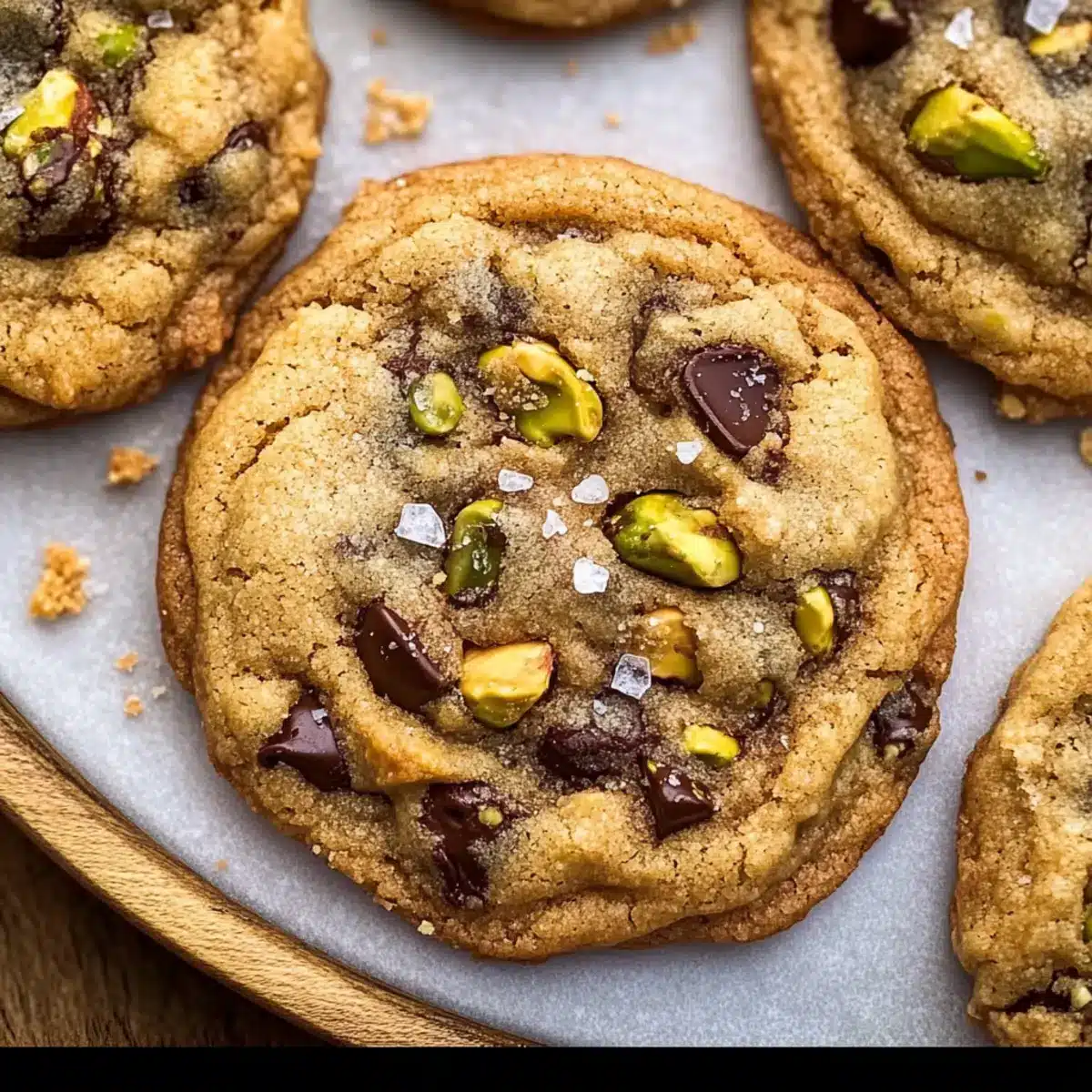 Once baked, let your cookies cool on the tray for about 5 minutes, then transfer them to a wire rack to cool completely. For an extra touch of flavor, sprinkle them with more chopped pistachios and flaky sea salt while they’re still warm—an irresistible finish to your Pistachio Chocolate Chip Cookies.