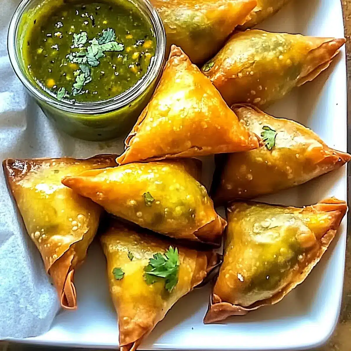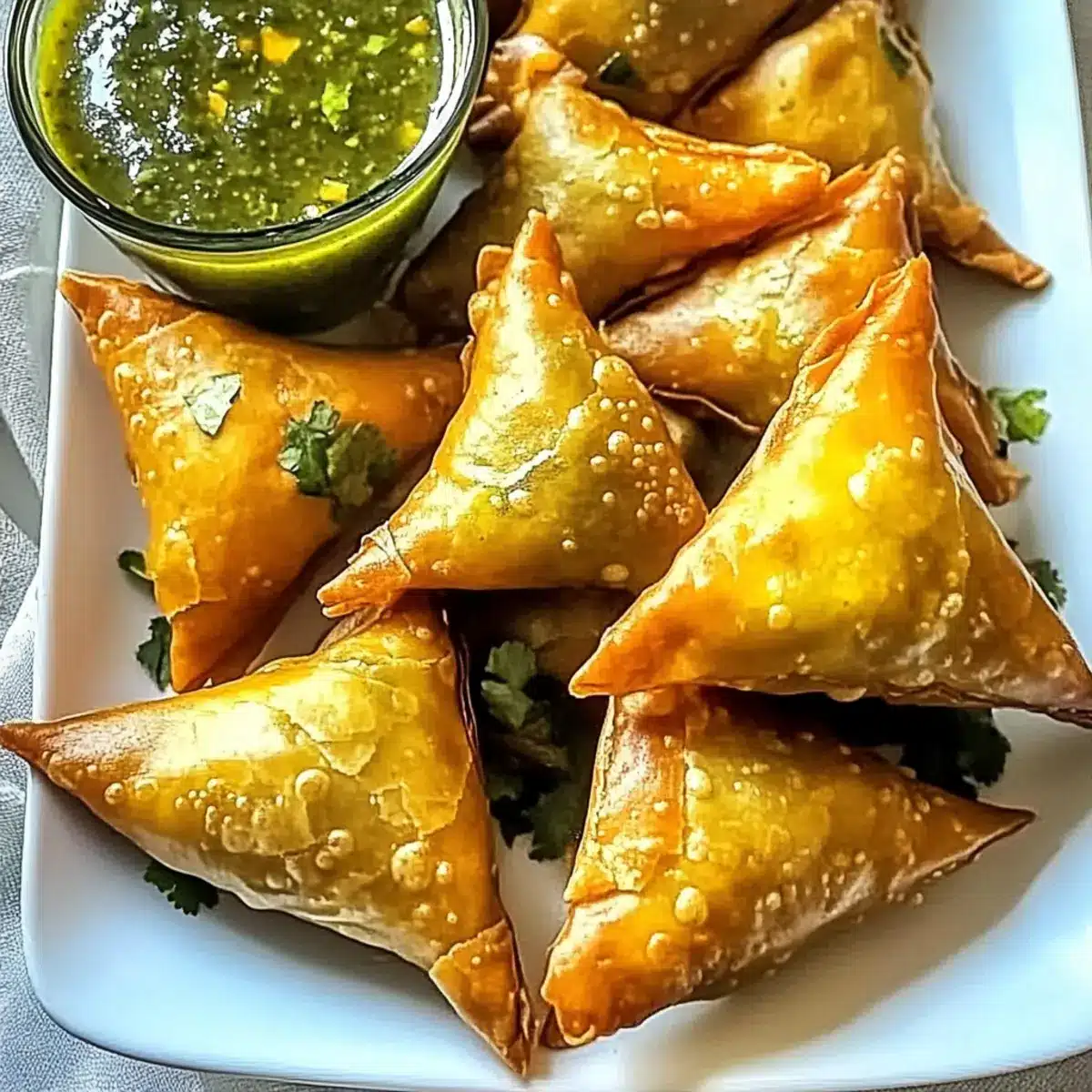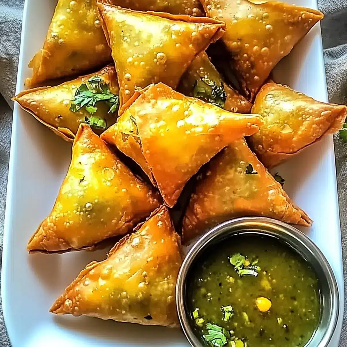 Tangy Green Chutney: A zesty, fresh addition that cuts through the richness of the samosas, enhancing every bite with vibrant flavor.