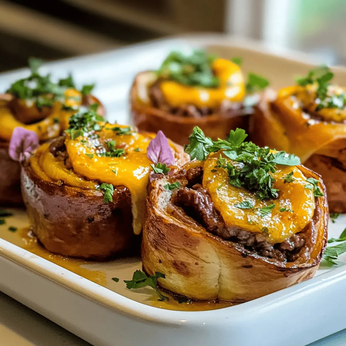 Once baked, remove the rolls from the oven and allow them to cool for a minute. Sprinkle with fresh chopped parsley for a pop of color and added flavor. Serve warm, and watch as everyone gathers around to enjoy these mouthwatering Roast Beef Cheddar Rolls!