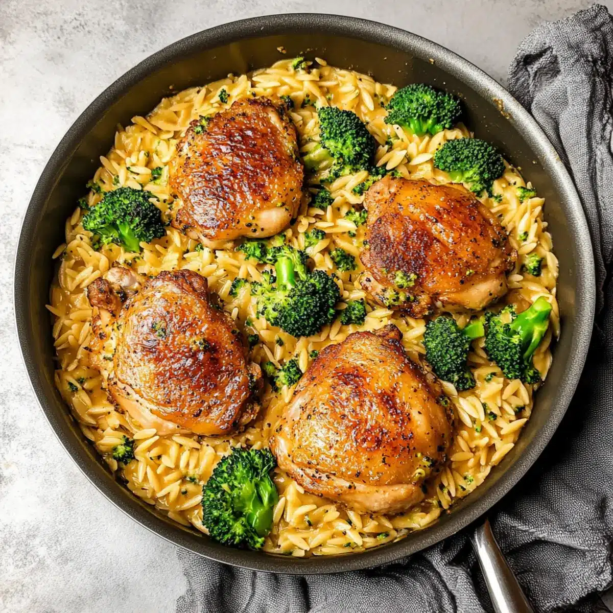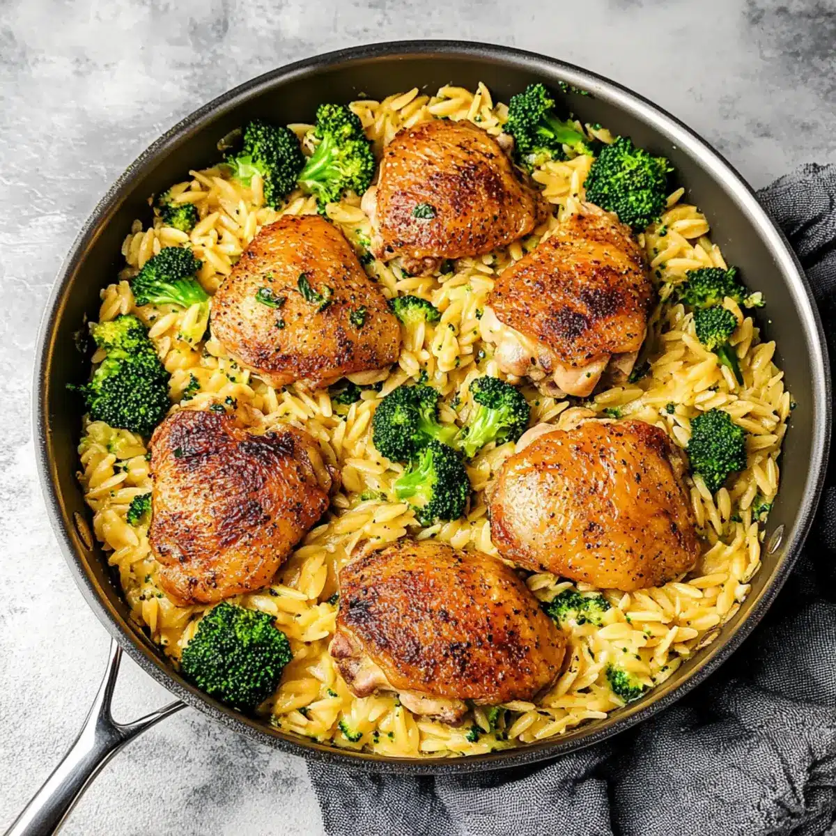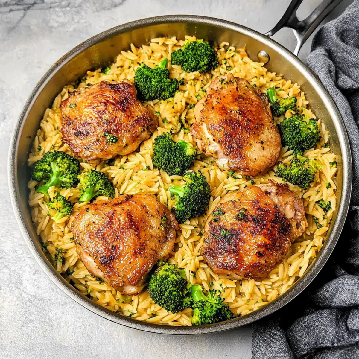 Skillet Chicken Thighs with Broccoli Cheddar Orzo Bliss
