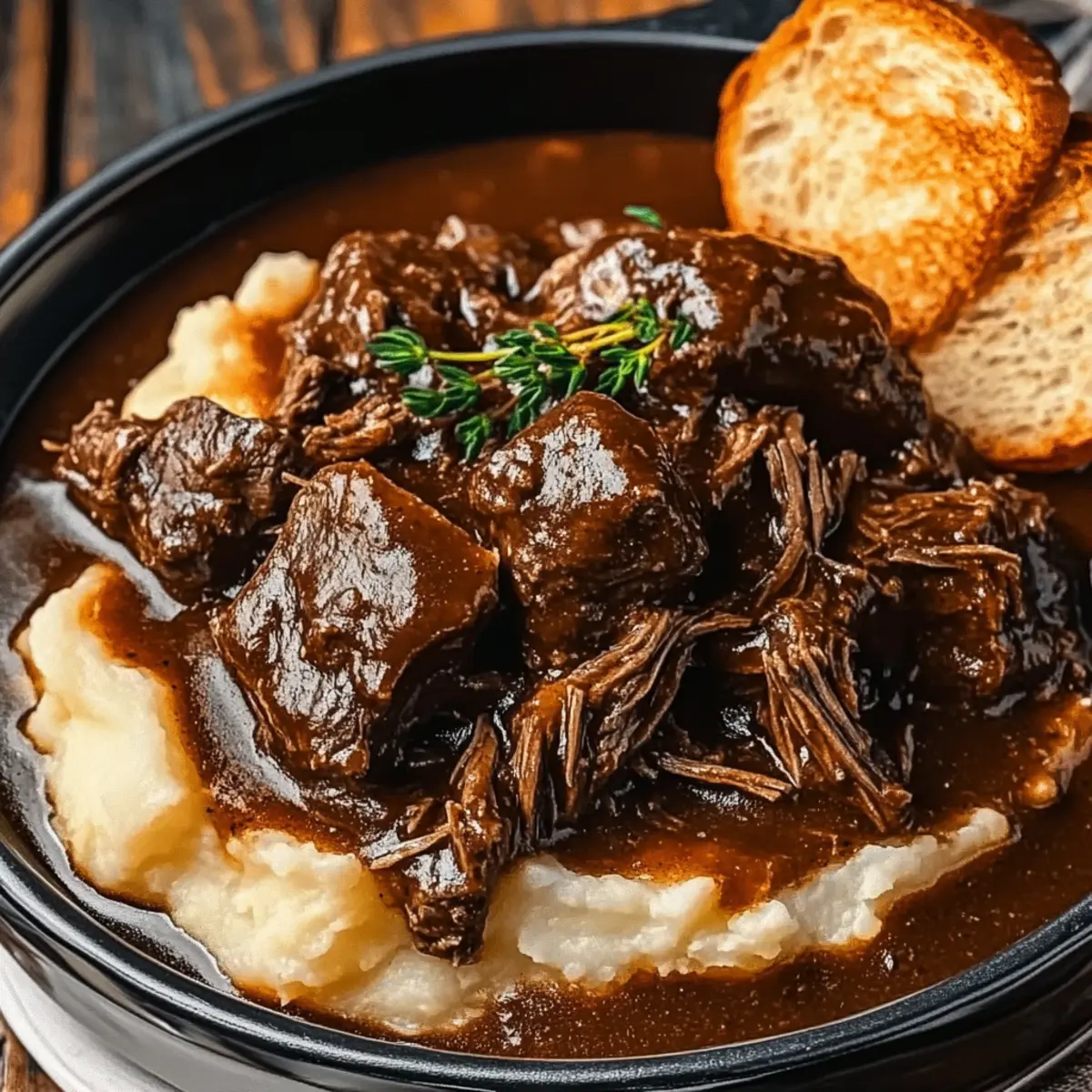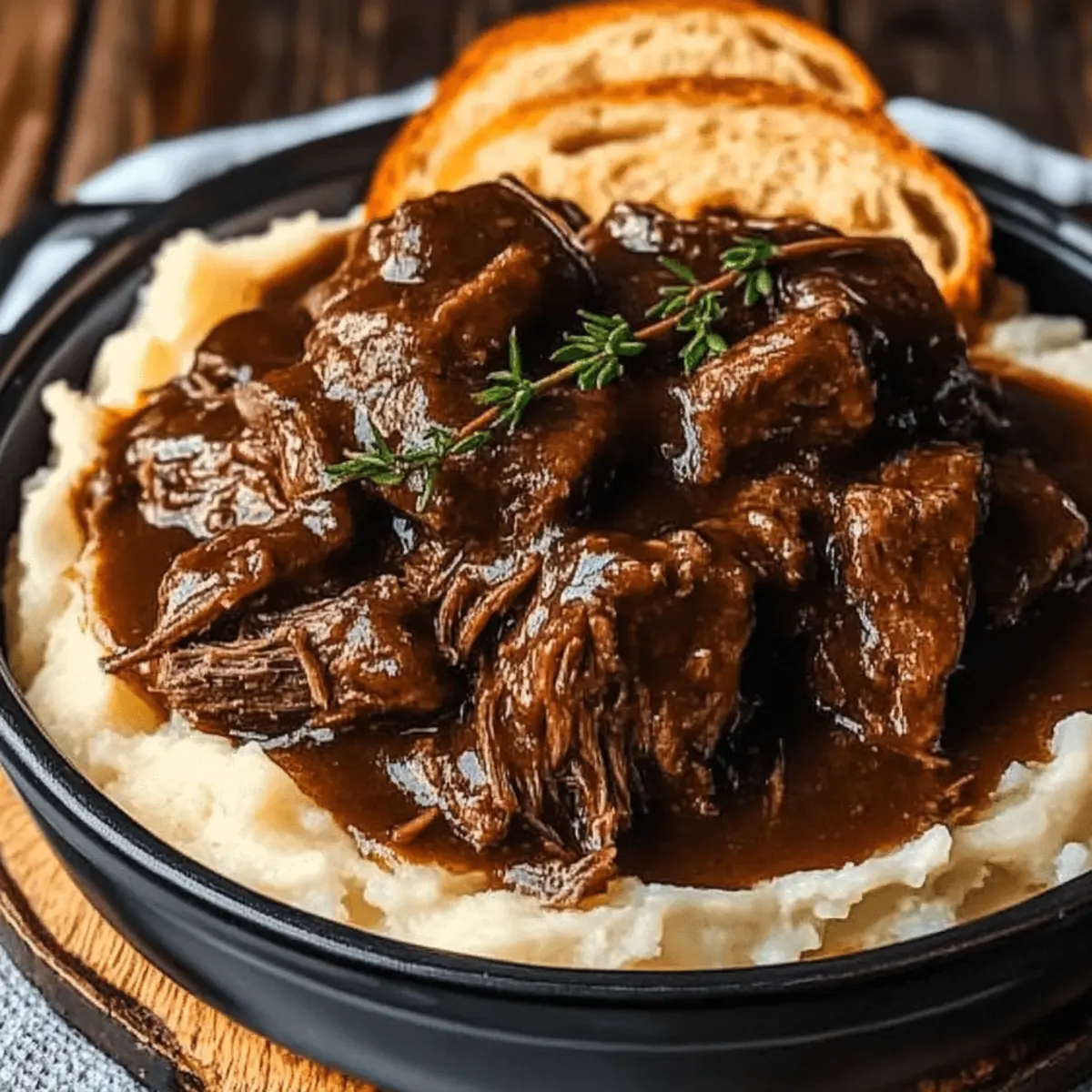 - To serve, place a slice of toasted bread on each plate. Layer mashed potatoes, followed by shredded beef, and ladle the thickened gravy over.
