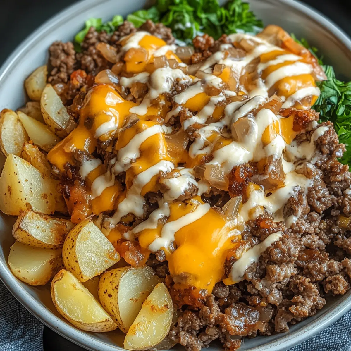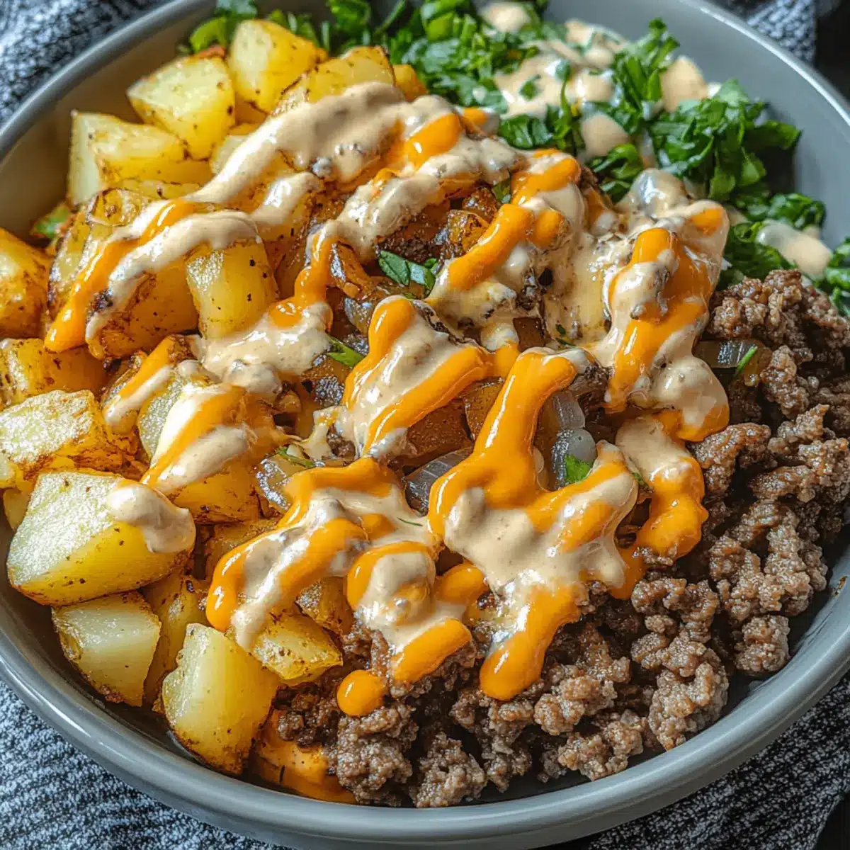 The Smash Burger Bowl is a fantastic choice for meal prep! You can prep all components up to 3 days in advance and store them separately in the refrigerator. Start by cooking the potatoes or rice and letting them cool before refrigerating. The caramelized onions can also be made ahead and stored in an airtight container. For the beef, you can cook it up to 24 hours before serving; just reheat it gently on the stovetop to maintain its moisture. Finally, assemble your bowls just before eating—layer the crispy base, beef, onions, and cheese, and drizzle with the sauce to enjoy a quick, satisfying meal that’s just as delicious as fresh-made!