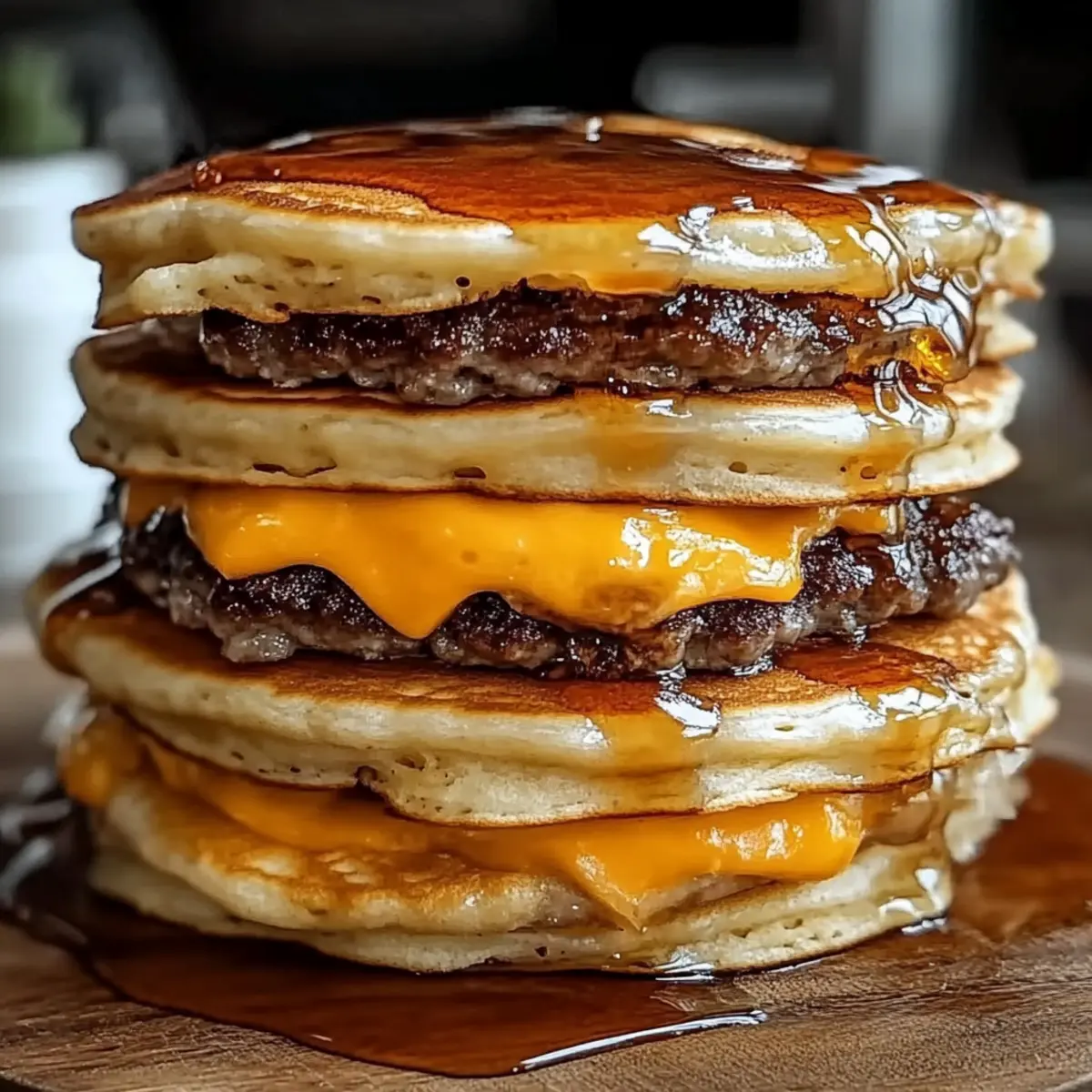 - To assemble, start with a pancake, layer with a burger patty, bacon if desired, and top with another pancake. Drizzle maple syrup before serving.
