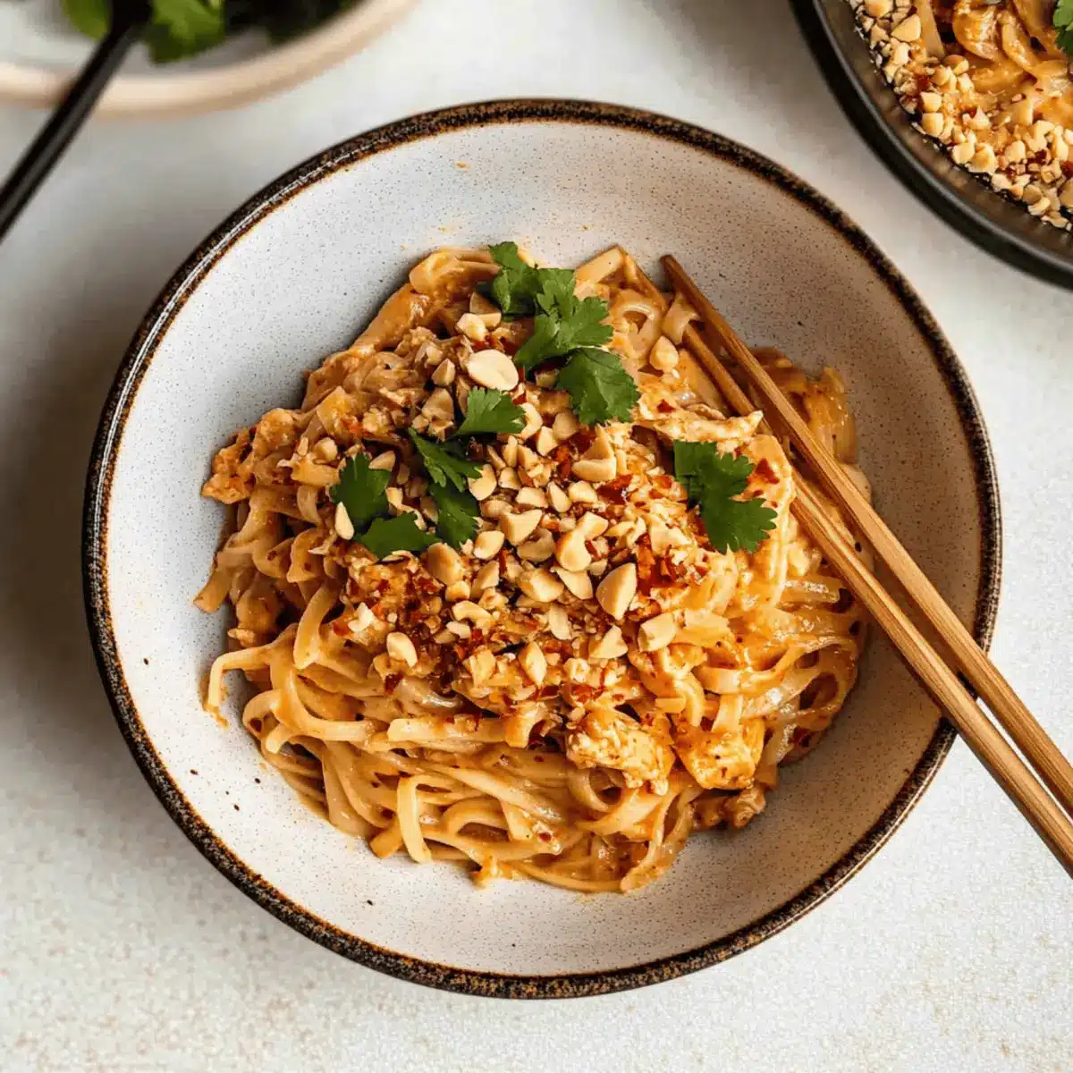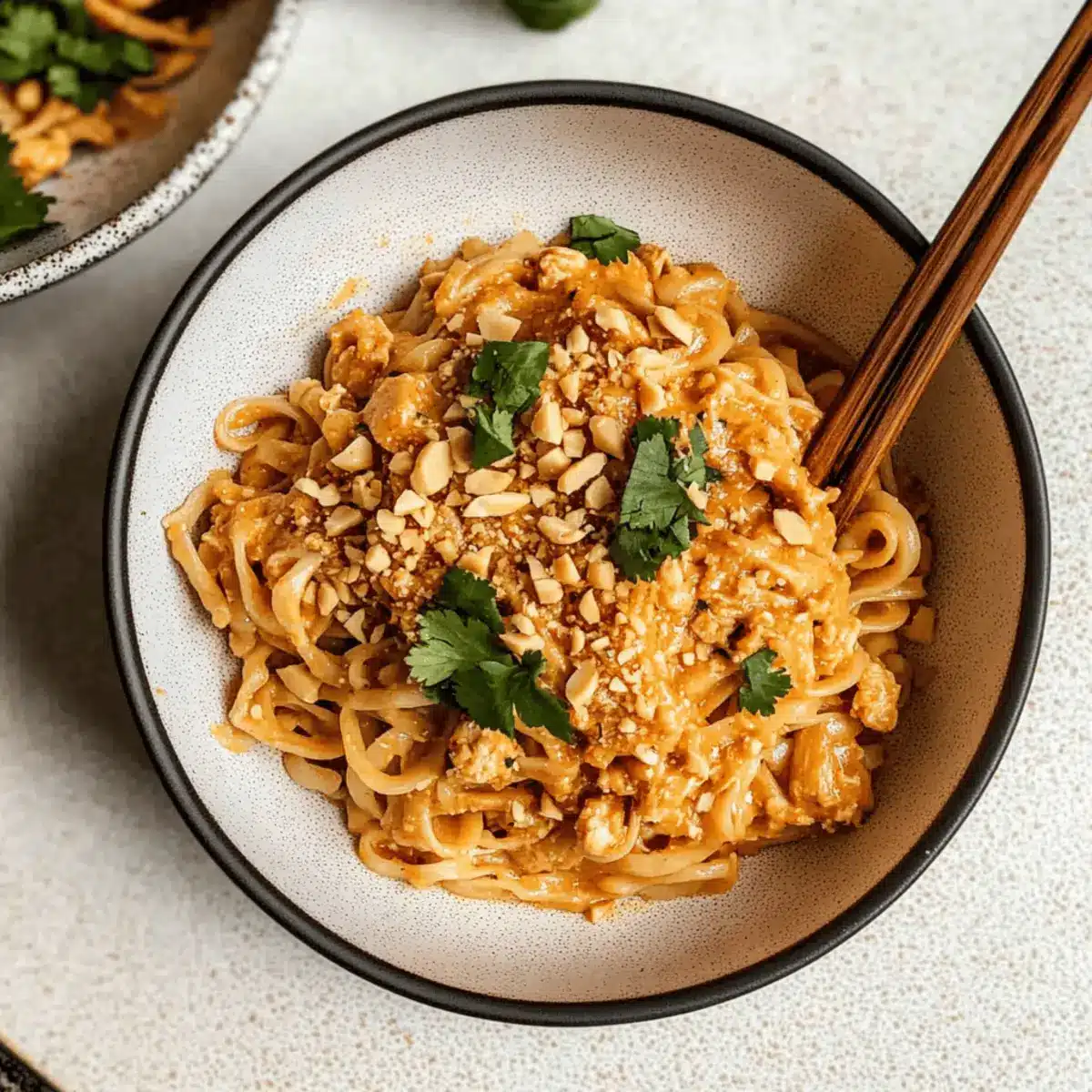 Transfer the Spicy Peanut Chicken Noodles to serving bowls and garnish with fresh cilantro, chopped peanuts, and a sprinkle of red pepper flakes for added heat. The vibrant colors and enticing aromas are sure to make this dish a showstopper at your dining table!