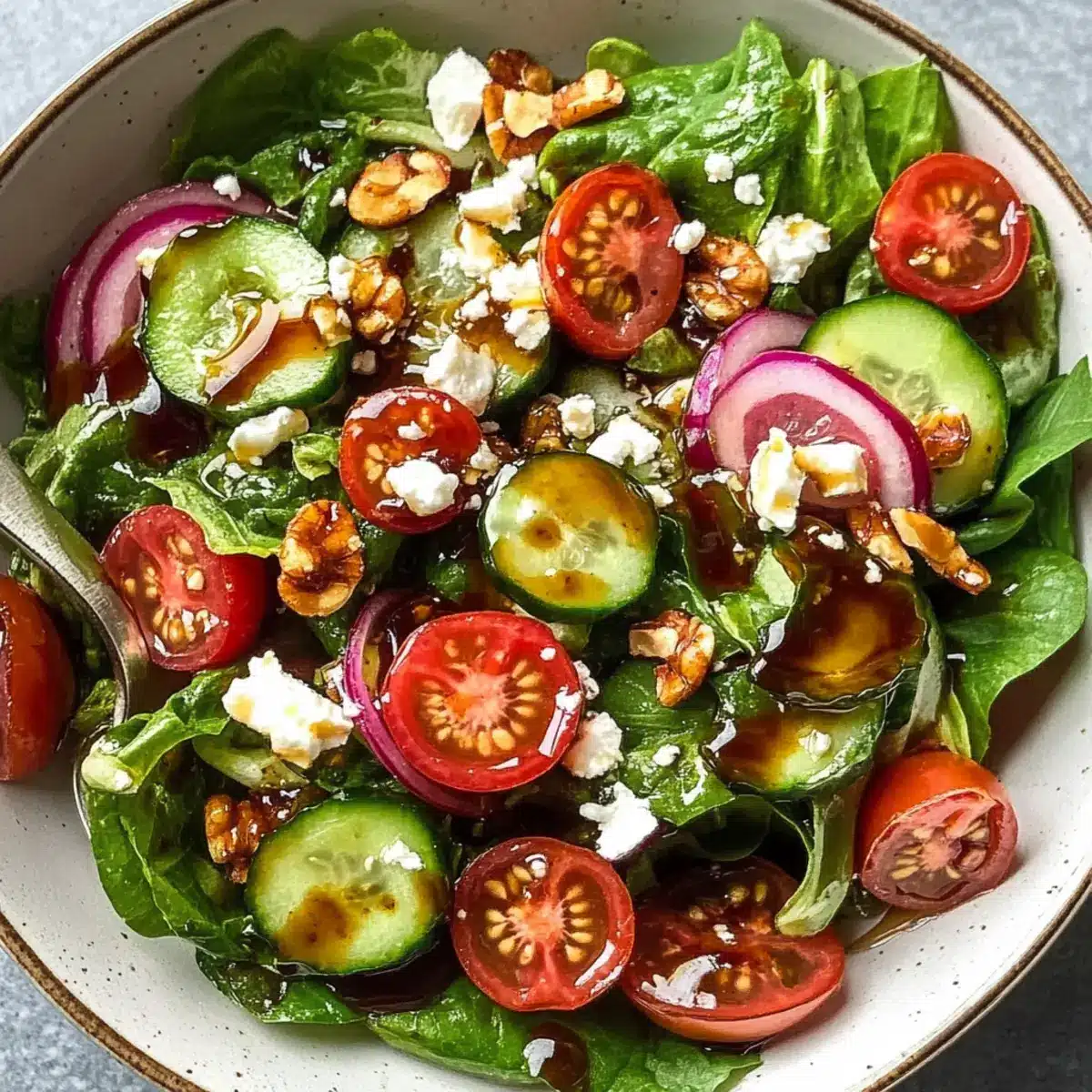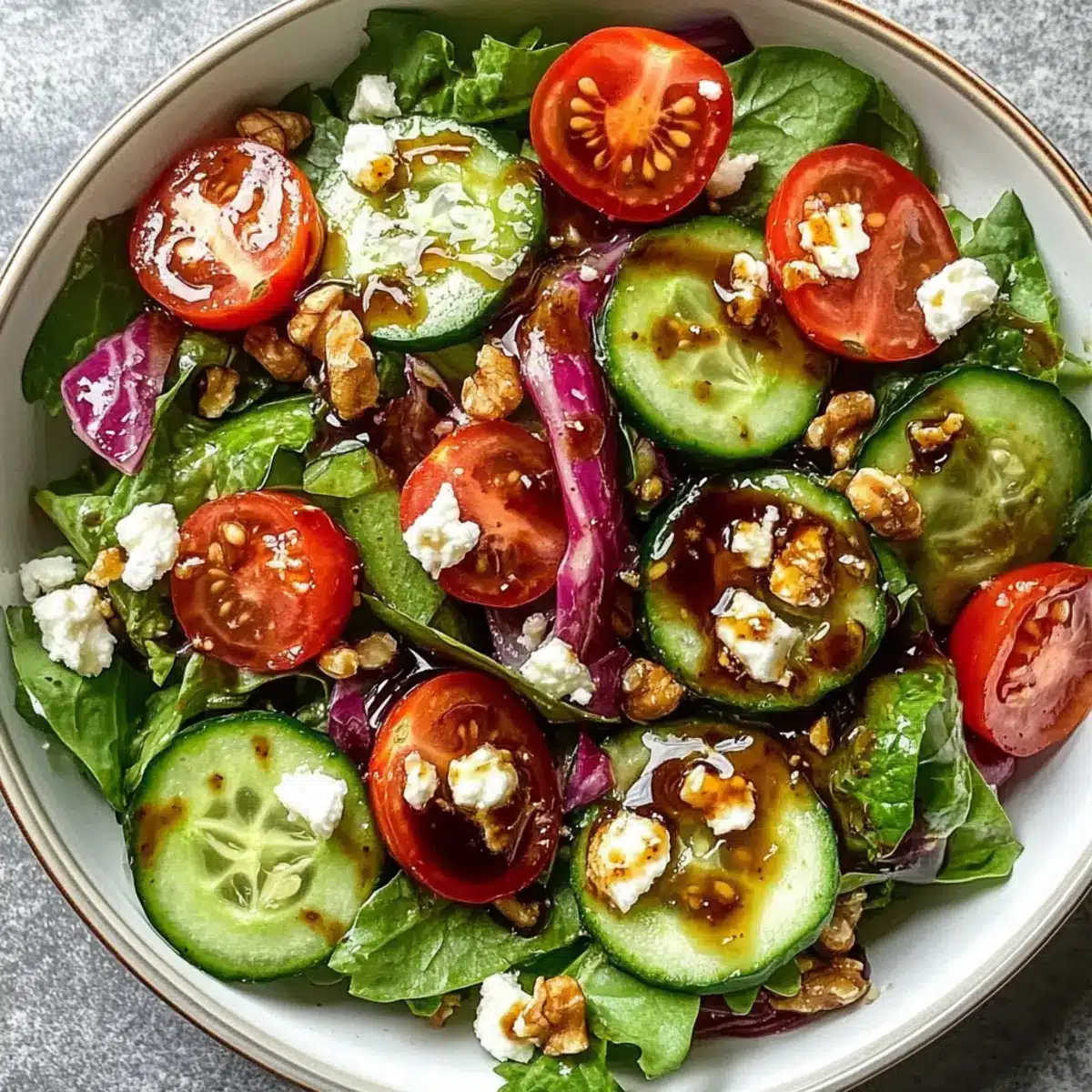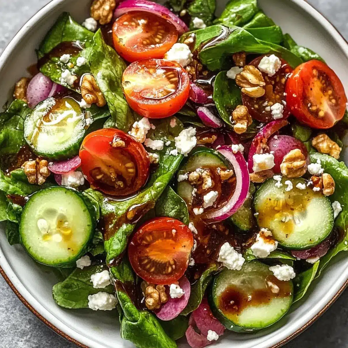 Absolutely! For the best flavor, choose spring mix salad greens that are vibrant in color without any brown spots or wilting. Look for cherry tomatoes that are plump and firm, avoiding any with dark spots. An English cucumber should feel crisp and have a smooth skin—if it’s too soft, it’s past its prime.