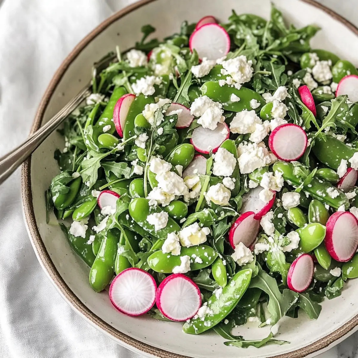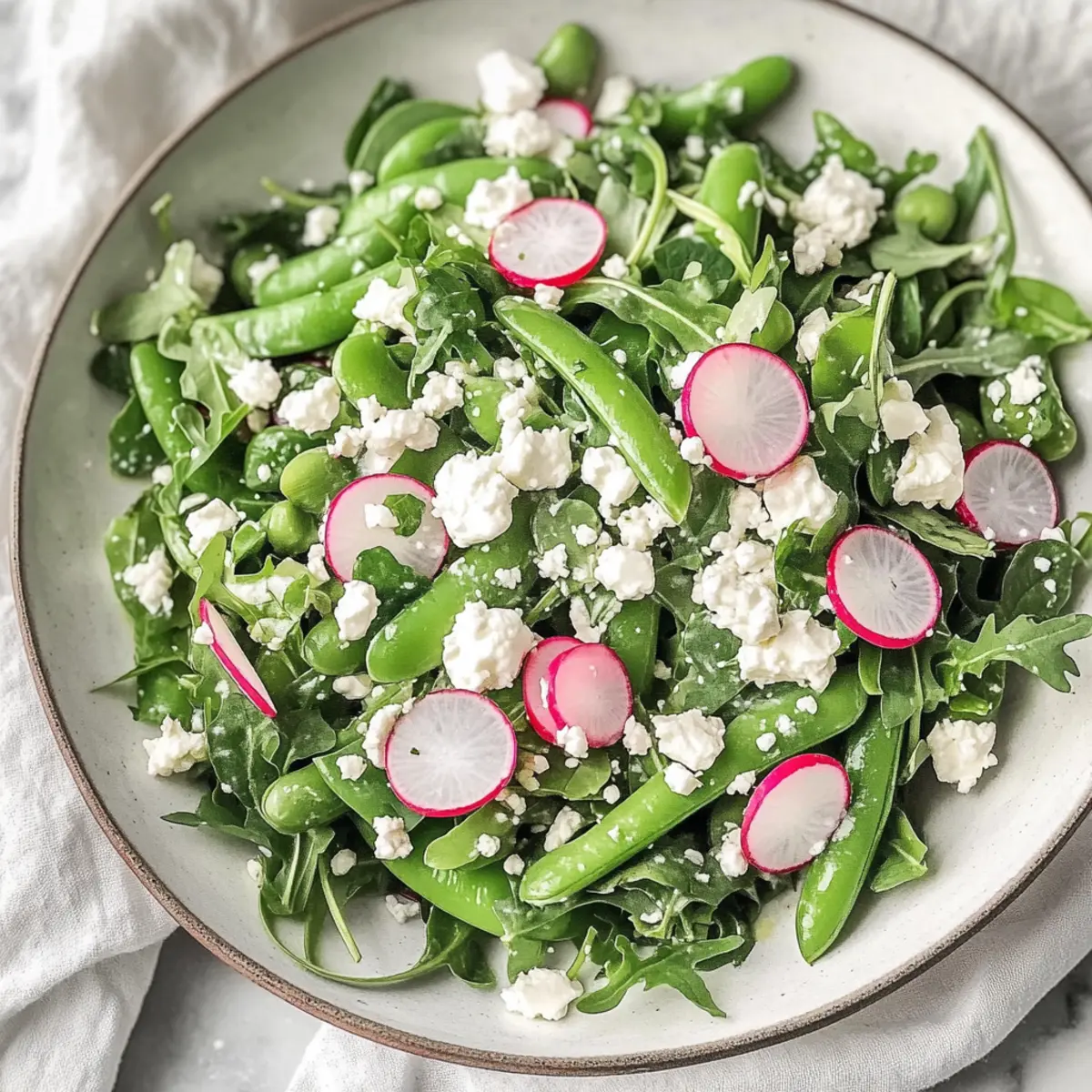 - Rinse and trim sugar snap peas and slice radishes thinly. In a large bowl, combine sugar snap peas, radishes, arugula, and feta cheese. Mix gently.