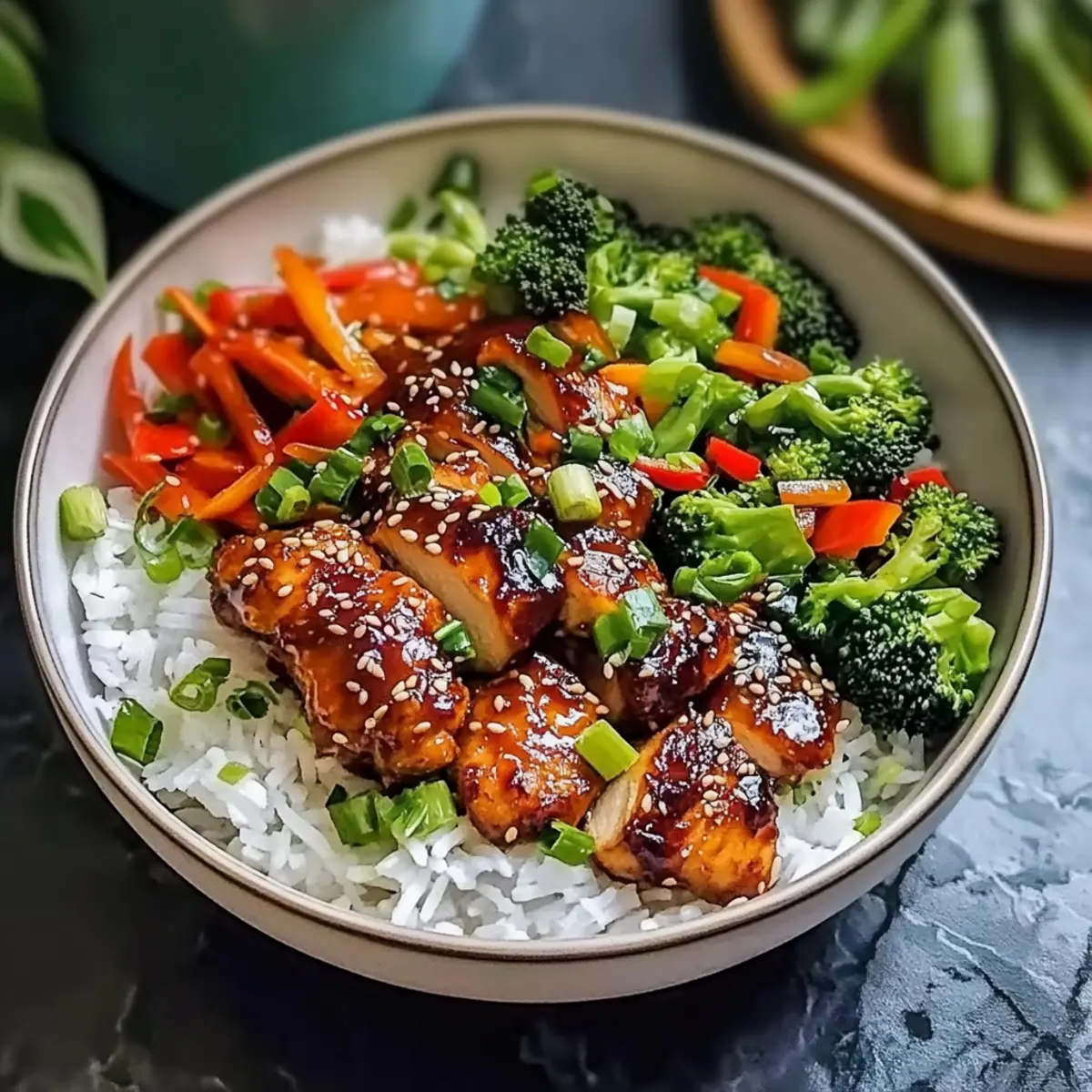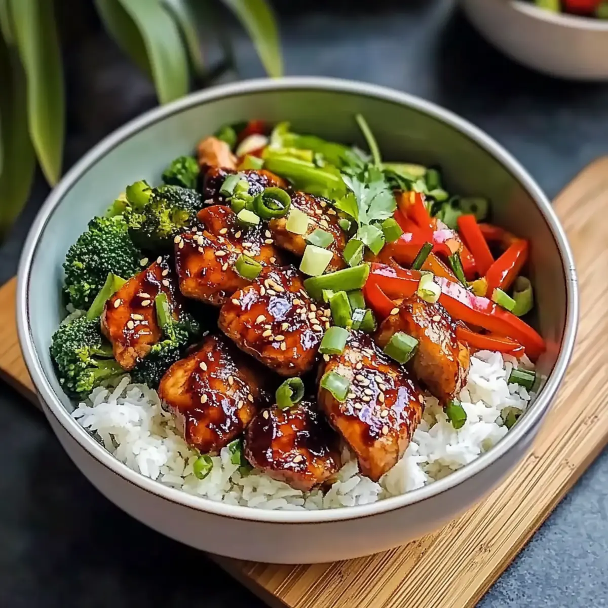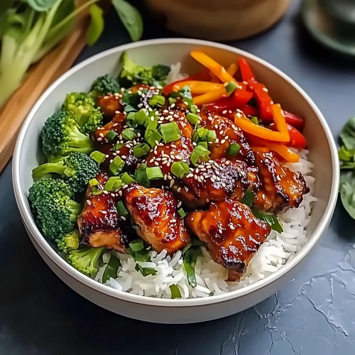- Assemble bowls with rice, chicken, vegetables, and garnish with green onions and sesame seeds.