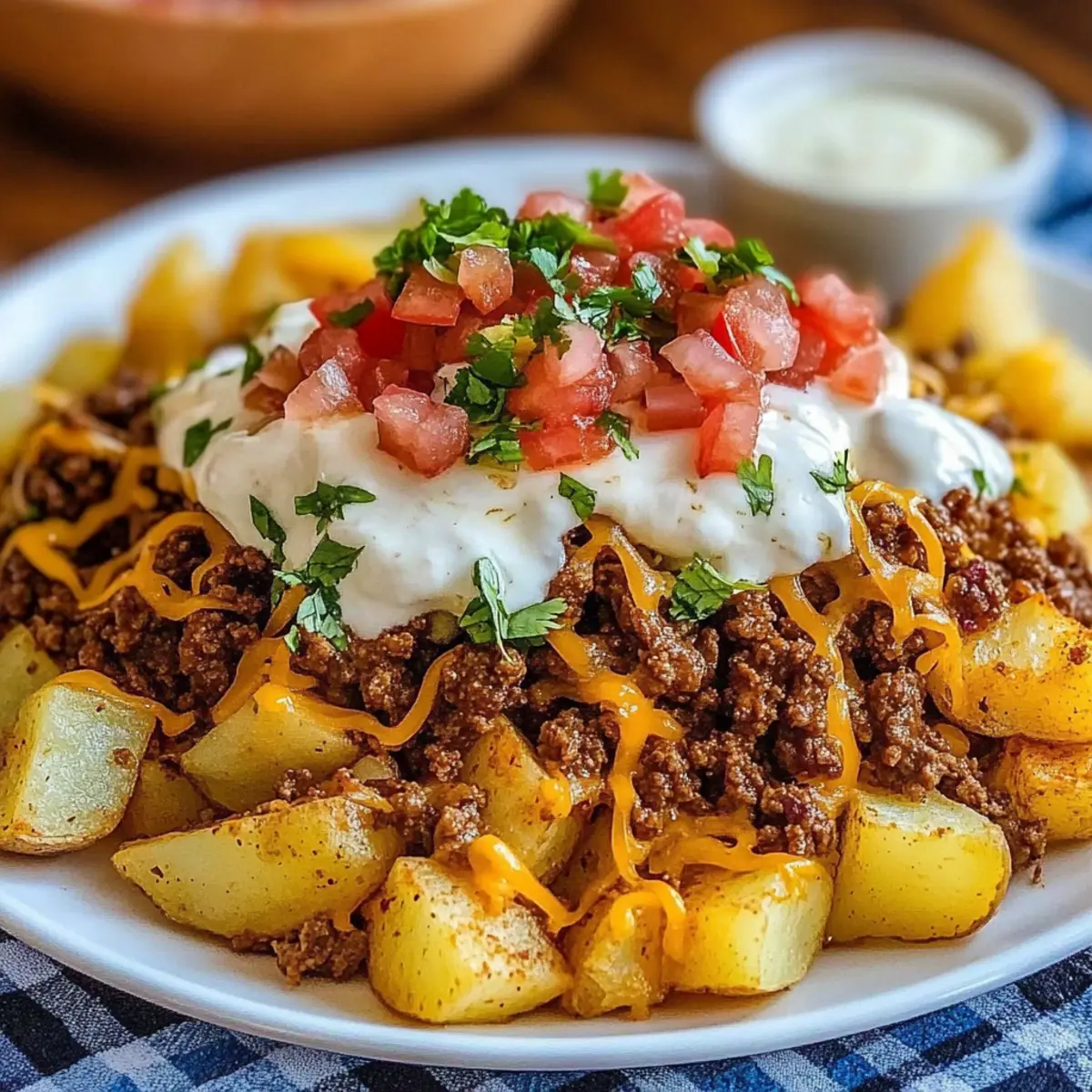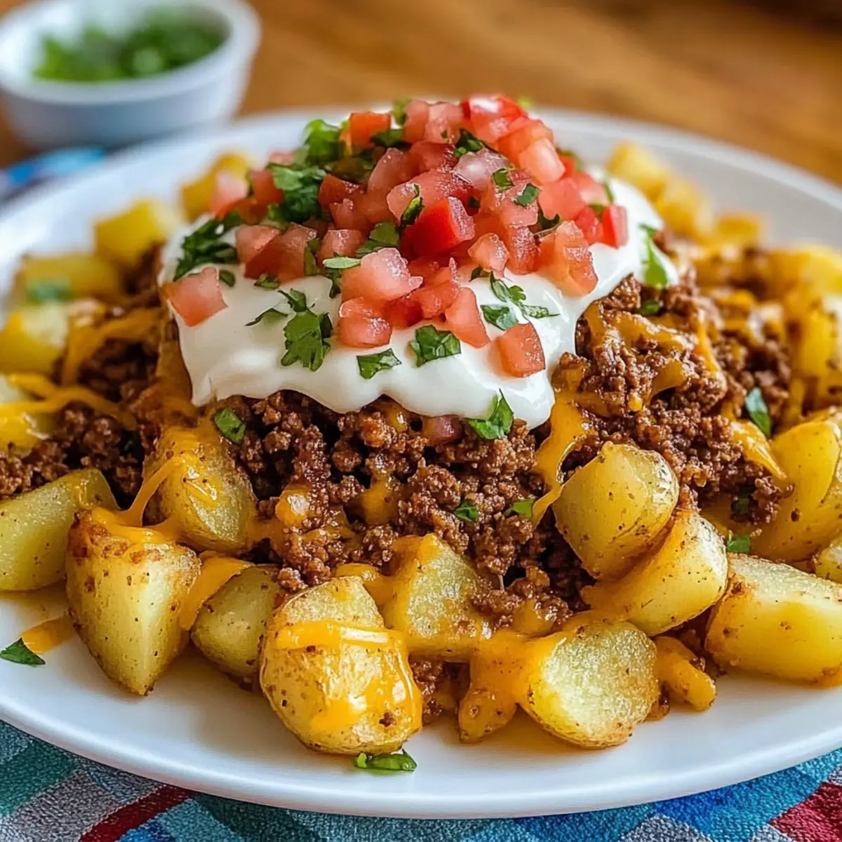 - To assemble, layer the crispy potatoes on a serving plate, top with seasoned ground beef, and sprinkle with shredded cheese.