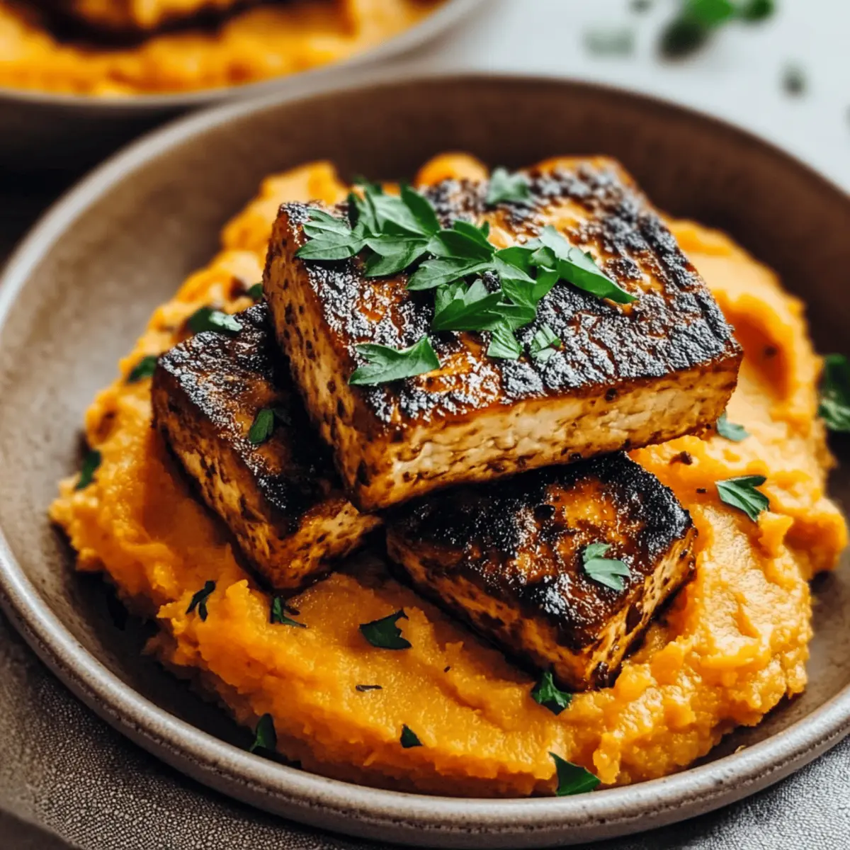 - Plate the dish by arranging mashed sweet potatoes and topping with crispy tofu steaks. Garnish with fresh parsley if desired.